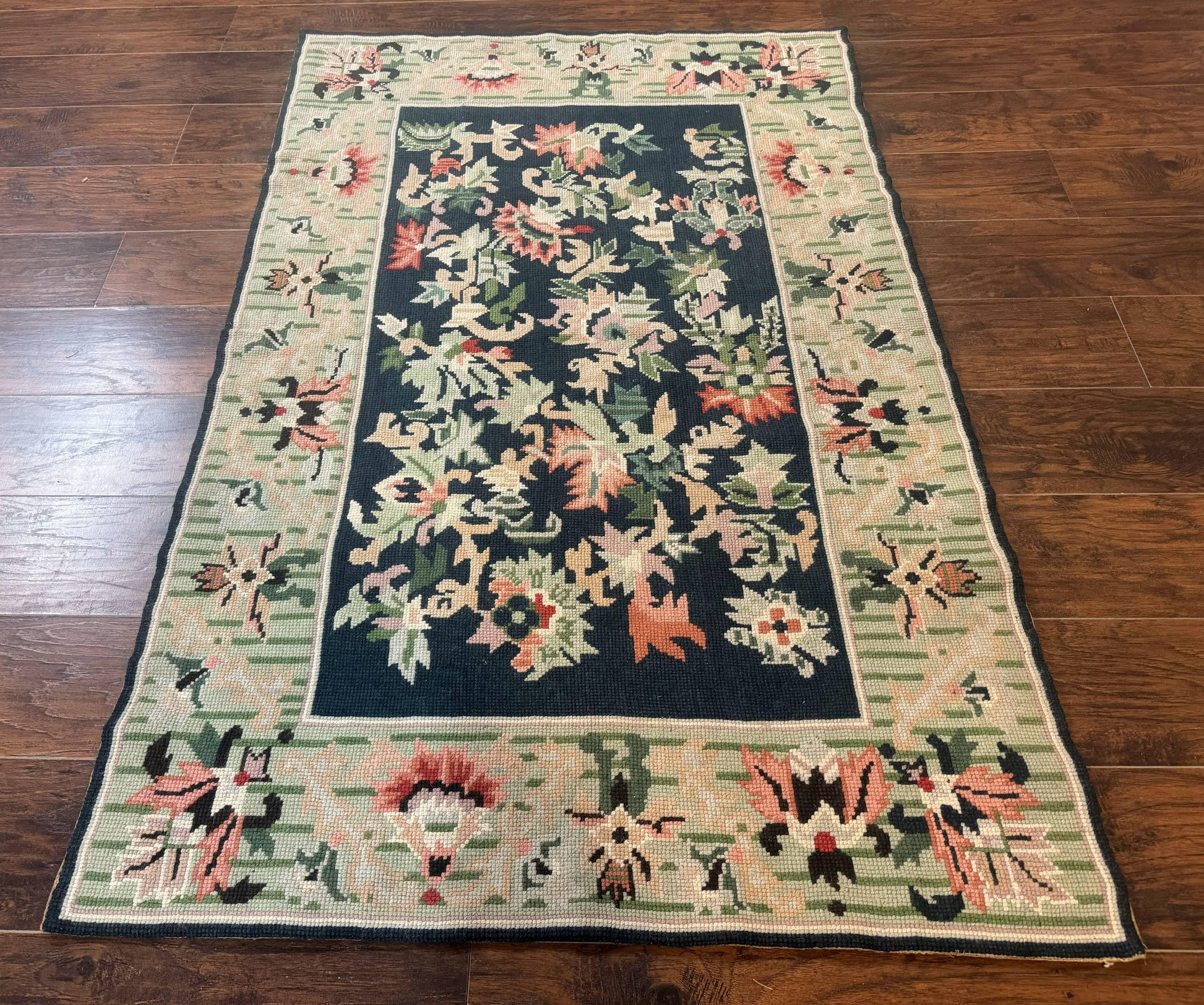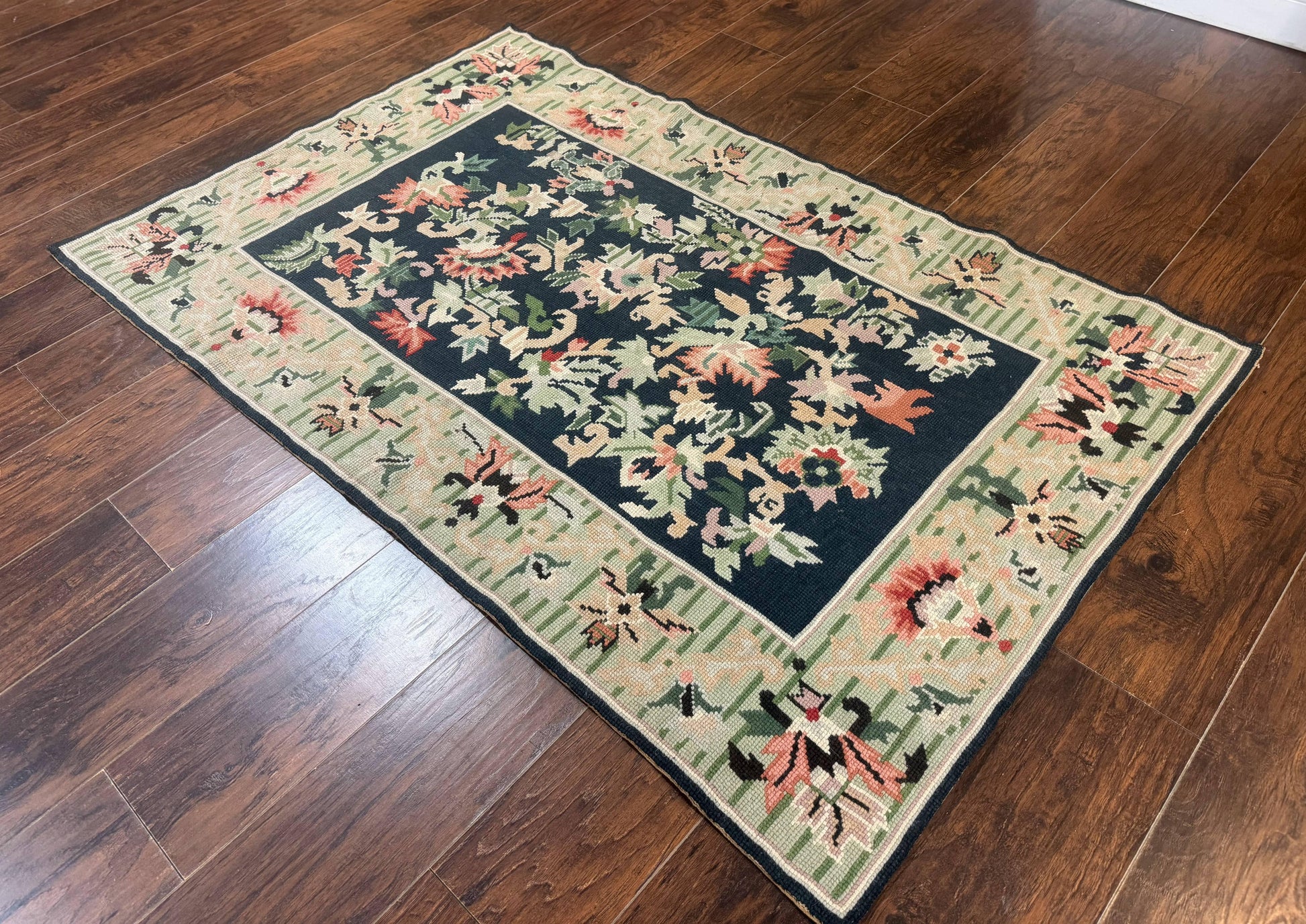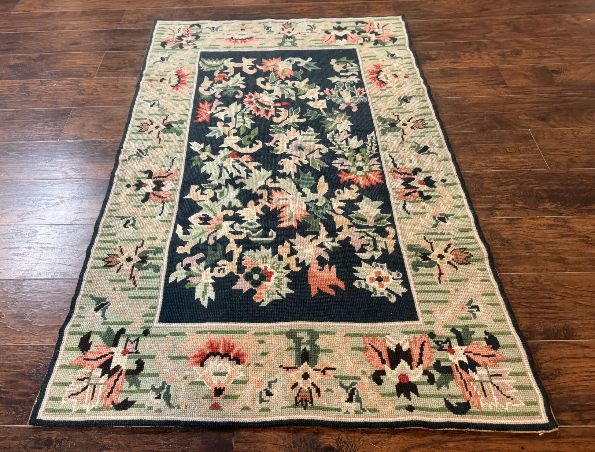 Vintage American Needlepoint Rug 4x6 Dark Green Wool Handmade Flatweave Carpet
