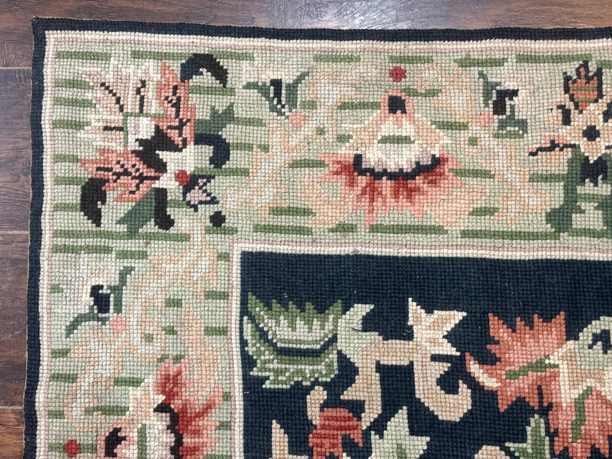- Construction: Handmade, hand-woven needlepoint; flatweave with a 1/8" pile