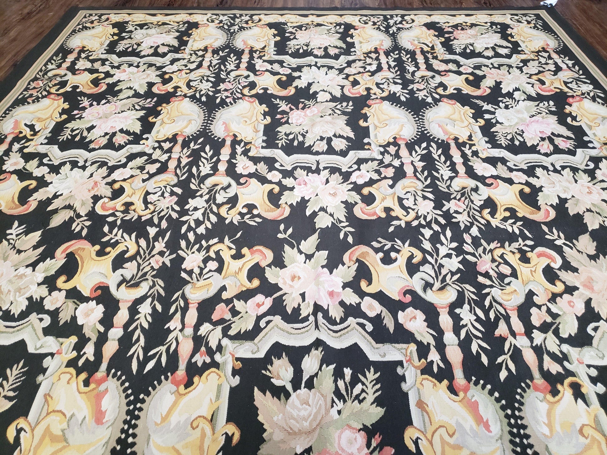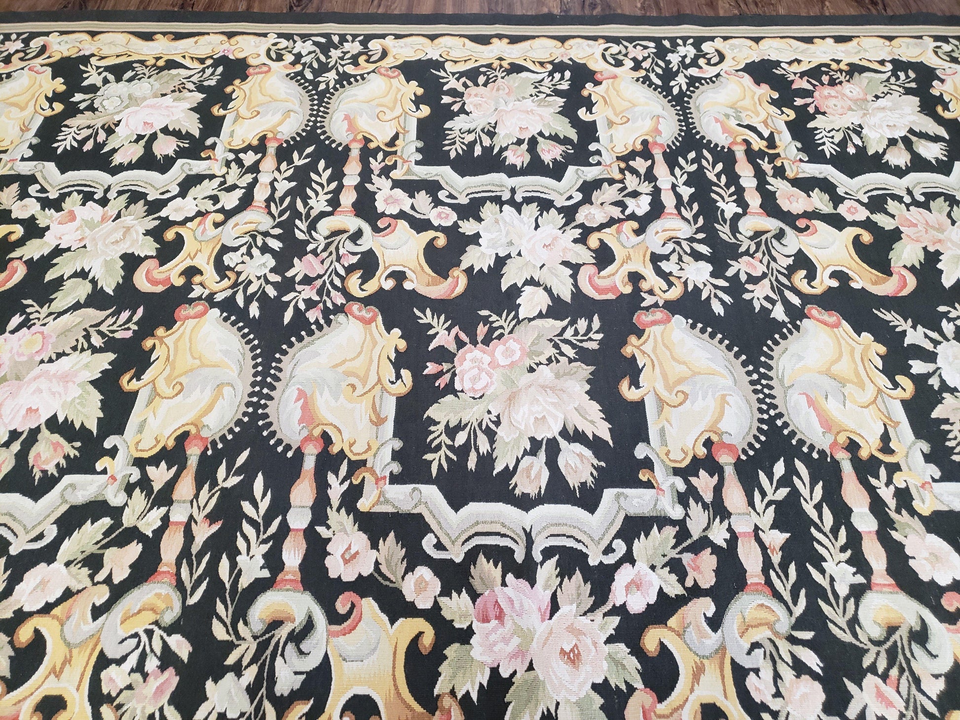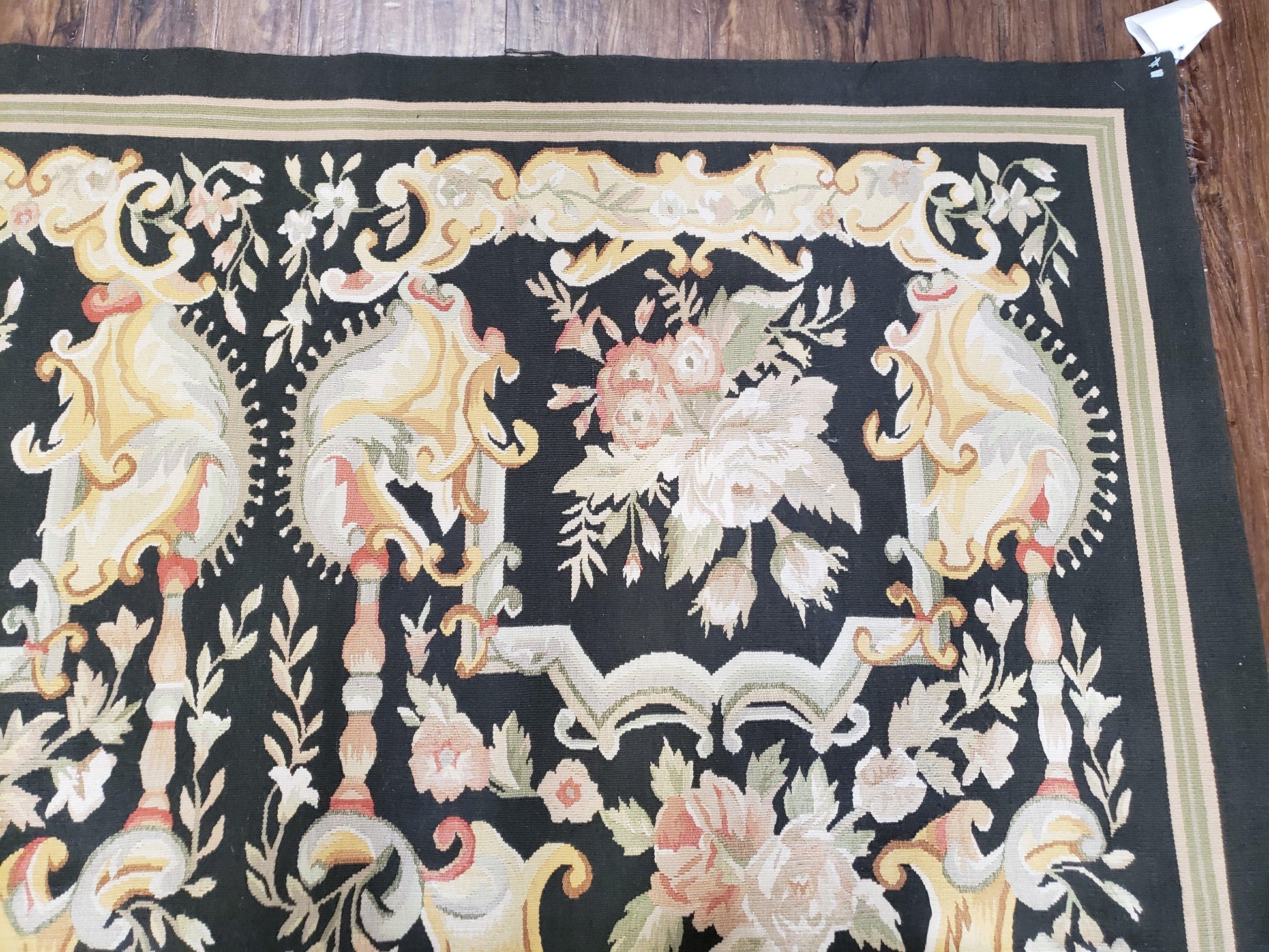 Vintage Black Aubusson Area Rug 8x10, Large Flowers Chinese Aubusson Carpet 7.9 x 10, Wool Hand-Knotted Floral Pattern Flat Weave Rug Nice