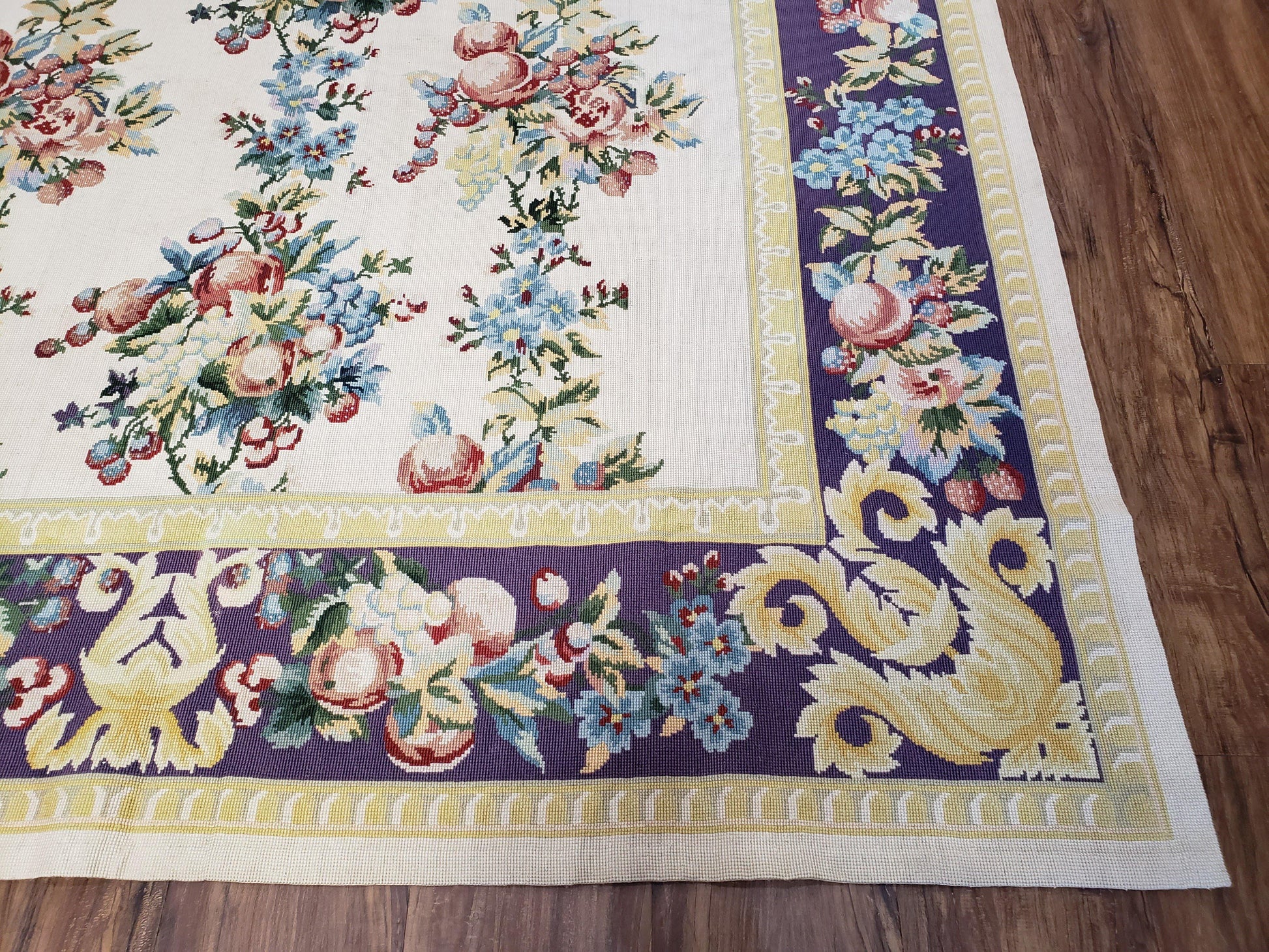 Vintage Chinese Floral Needlepoint Rug Wool Handwoven Flatweave Area Rug 6x9 Ivory Purple Dining Room