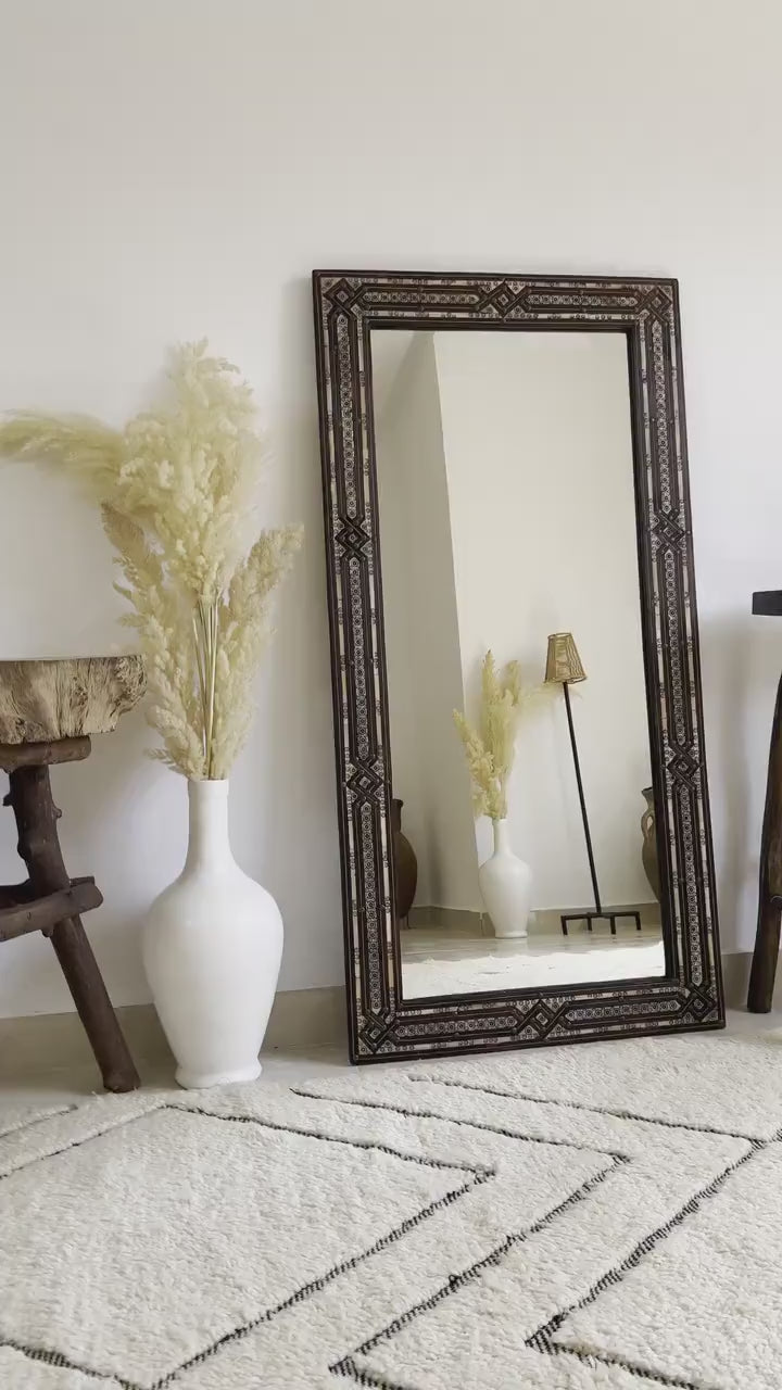 Transform your living space into a bohemian haven with the exquisite Moroccan vintage full length mirror handcrafted by our skilled artisans. This stunning piece is guaranteed to catch the eye, serving as an alluring centerpiece in any room. Its solid bone and gleaming metallic-gold brass frame exude an air of sophistication and elegance.