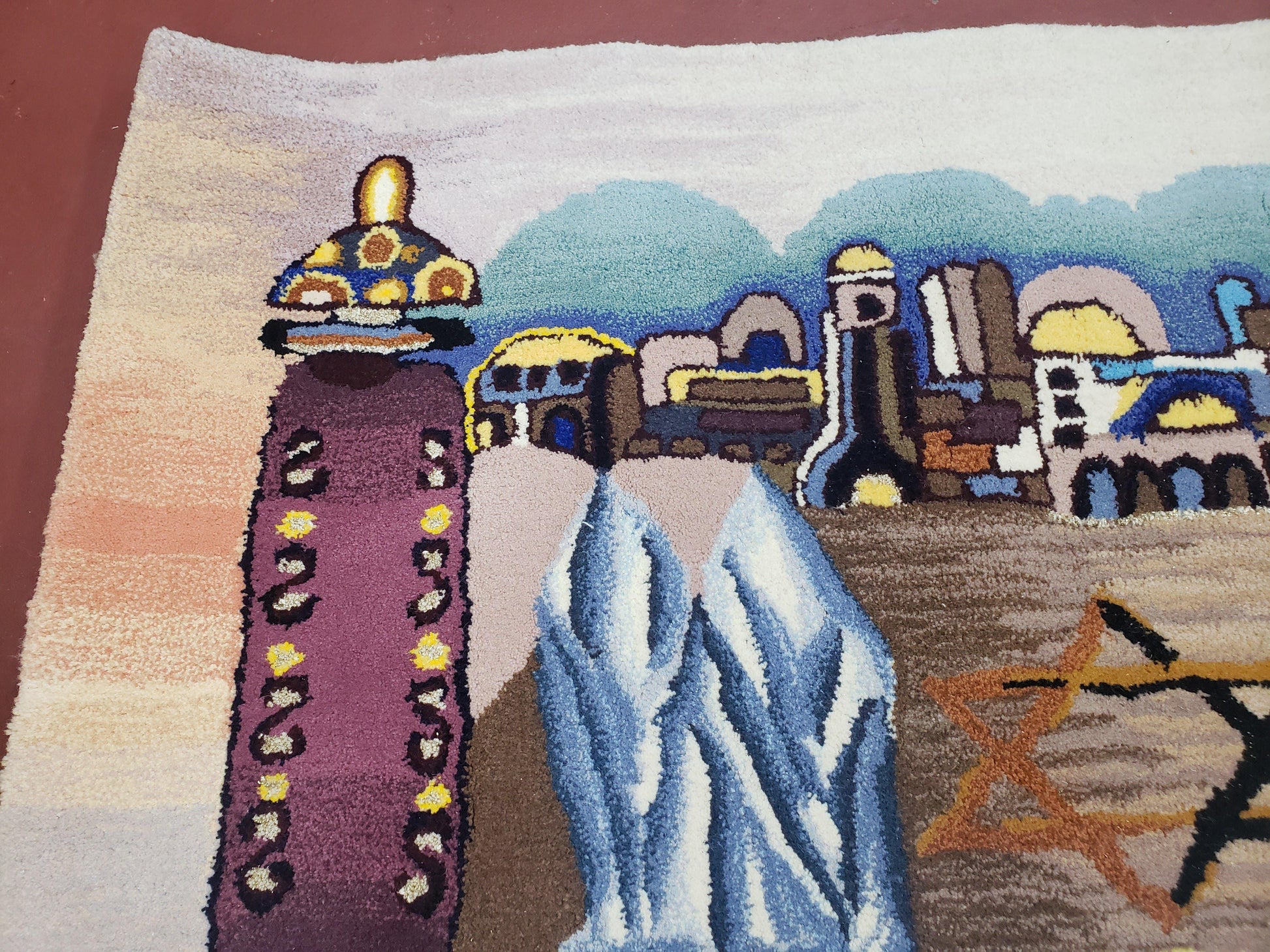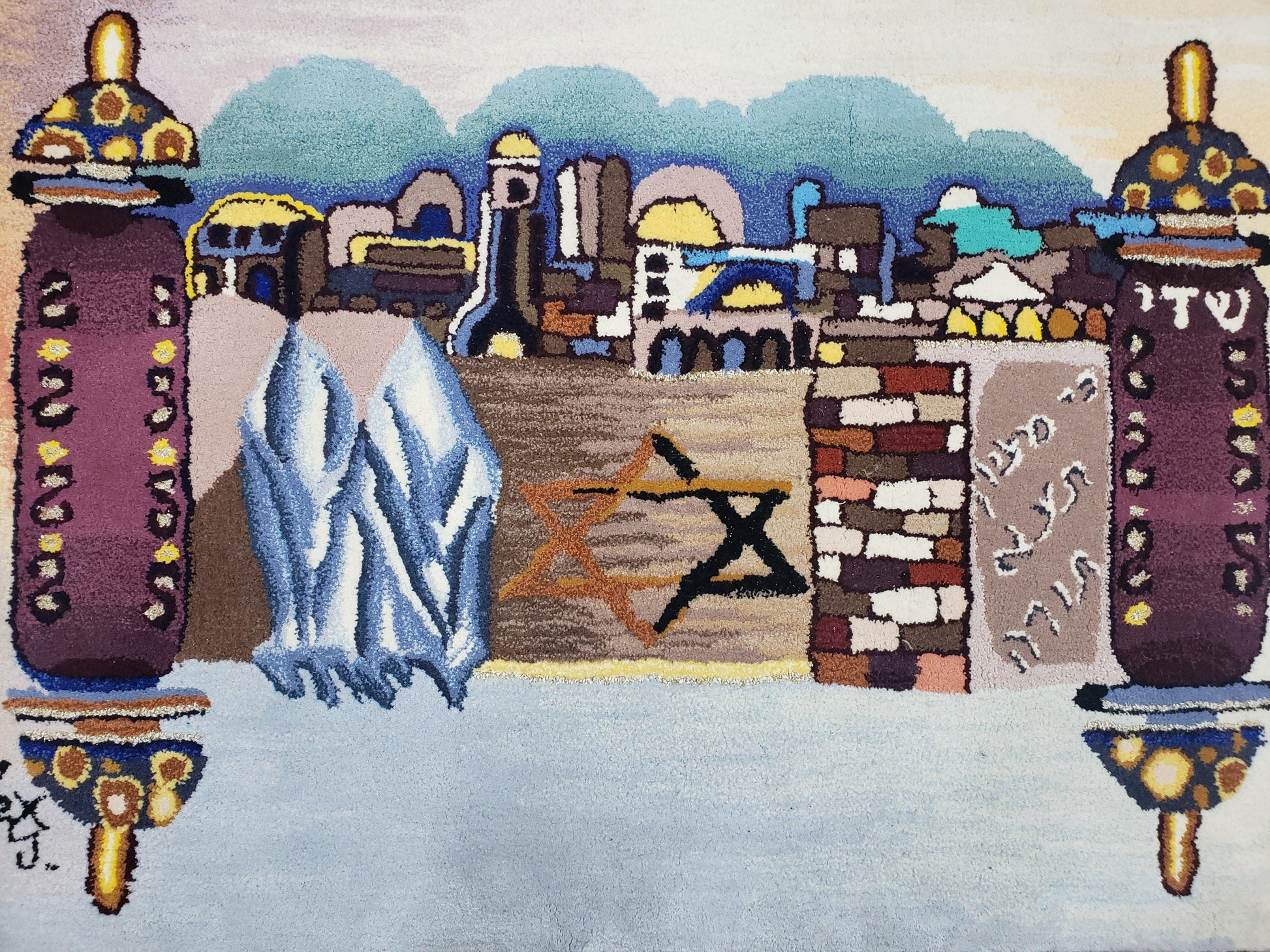 Vintage Judaica Pictorial Rug 3x5, Wool Hand-Tufted Israeli Signed Rug, Jerusalem Rug, Star of David Torah Scroll Verses, Chanuka Gift