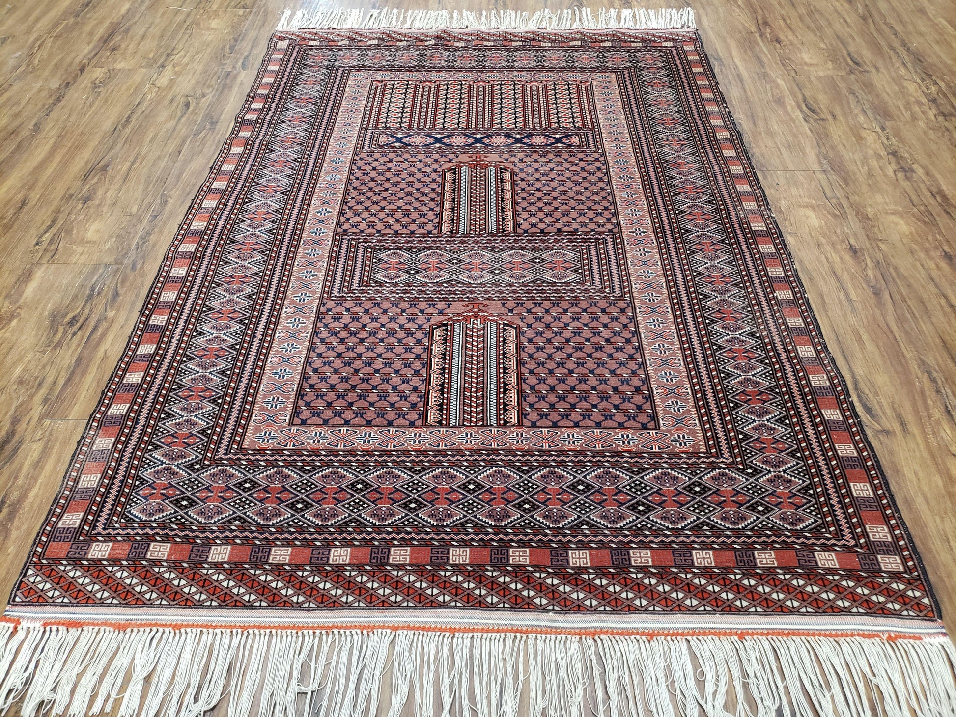 A lovely vintage handmade, hand-knotted wool Turkoman Bokhara area rug. Sized approximately 4'2" x 5'11", it brings warm, artisanal character to living rooms, bedrooms, or entryways.