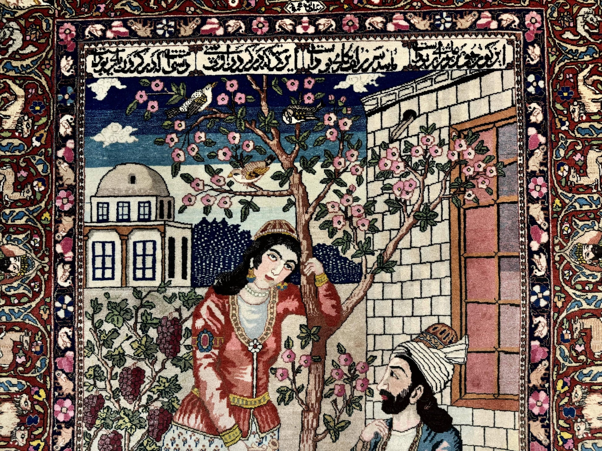 | Condition/Notes | Very good condition. Wonderful pictorial rug. Great details and colors. Very finely hand knotted, with a knot density of 240 KPSI. Features verse of Persian poetry and many animal pictorials. Free of stains, odors, discolorations, tears, etc. Recently cleaned and ready to be enjoyed in your space. |