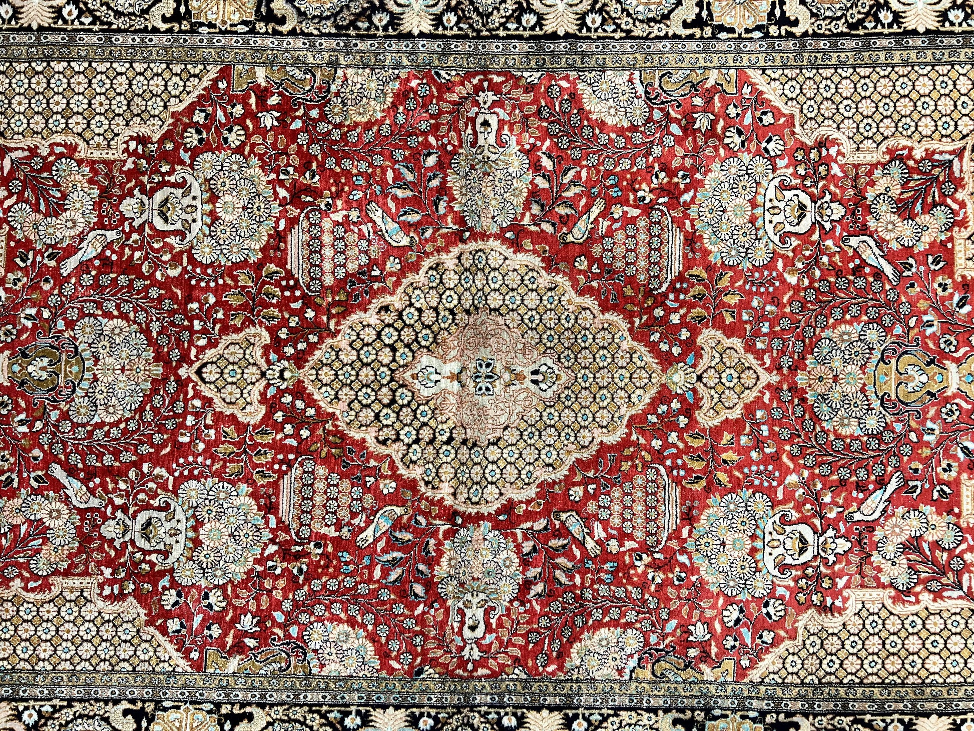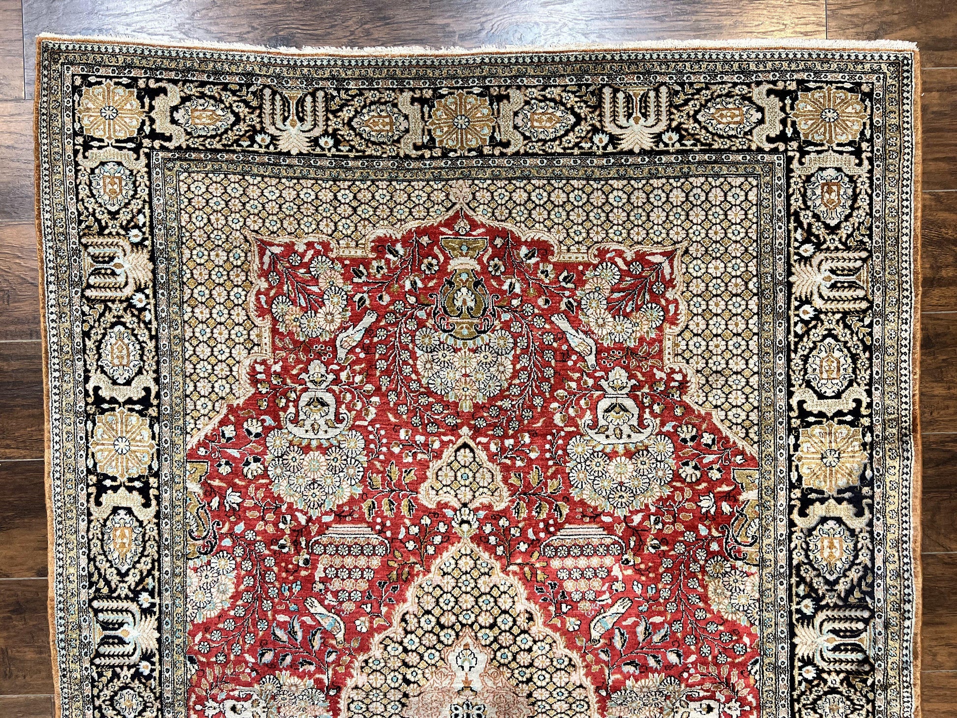 Persian Silk Rug 5x7 Hand Knotted Vintage Qum Carpet With Birds Floral Vases Red