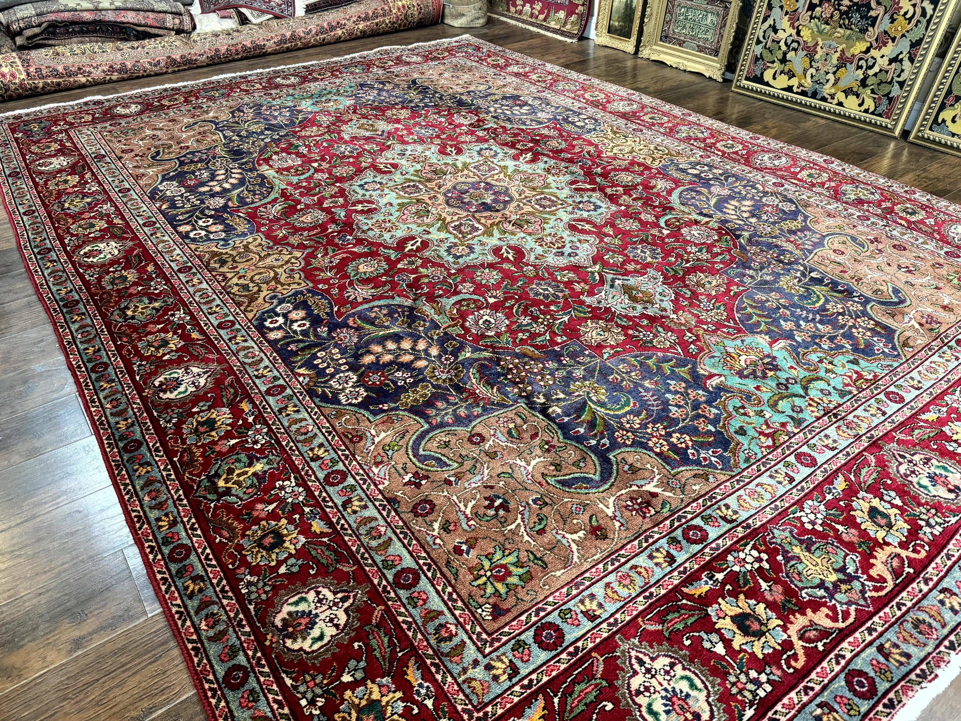 Introduction This wonderful semi-antique Persian Tabriz rug is a handmade, hand-knotted wool area rug designed to elevate large living spaces. Measuring 10' x 14' and recently cleaned, it features a vibrant floral medallion in red, navy blue, teal, and taupe.