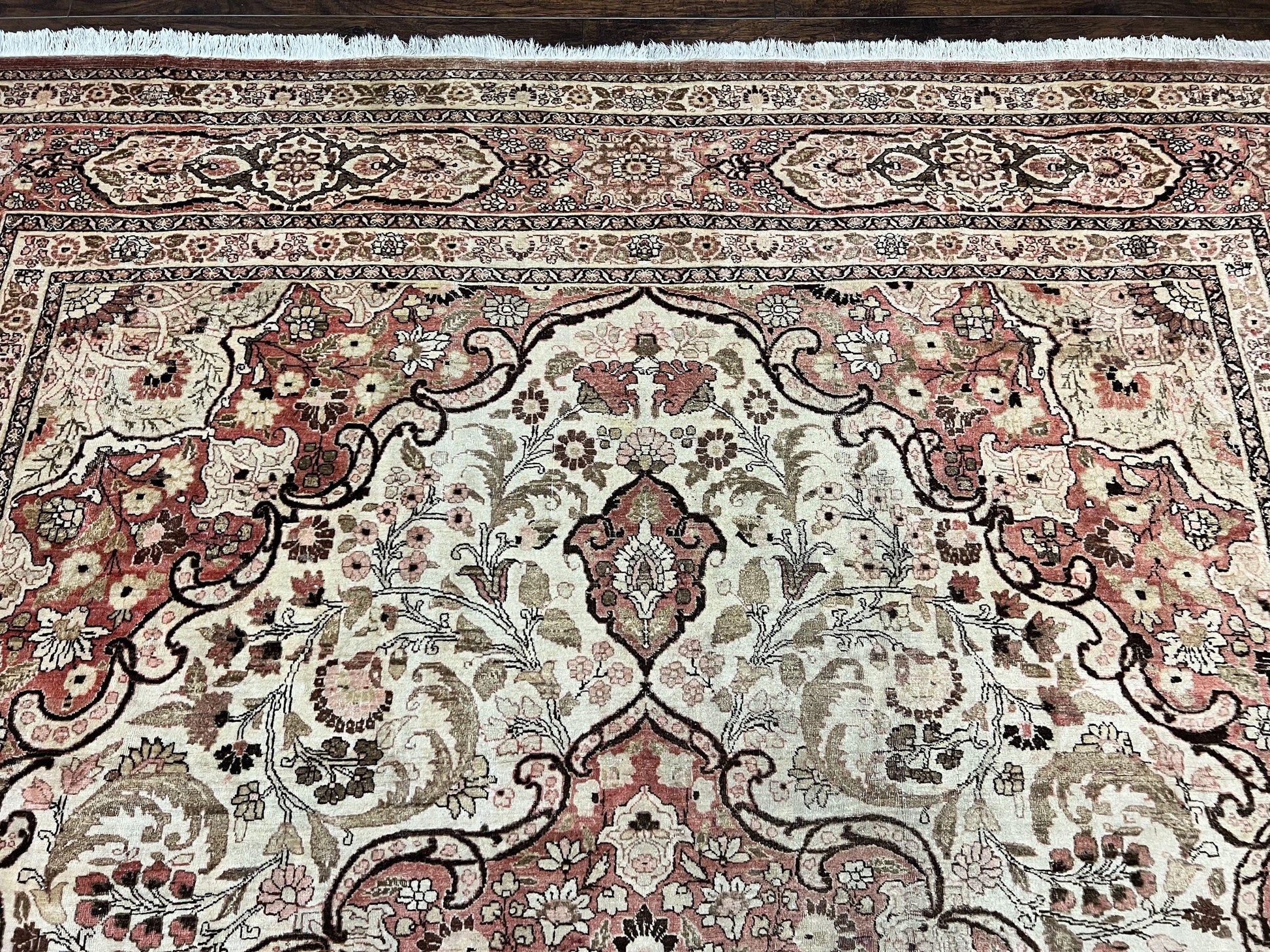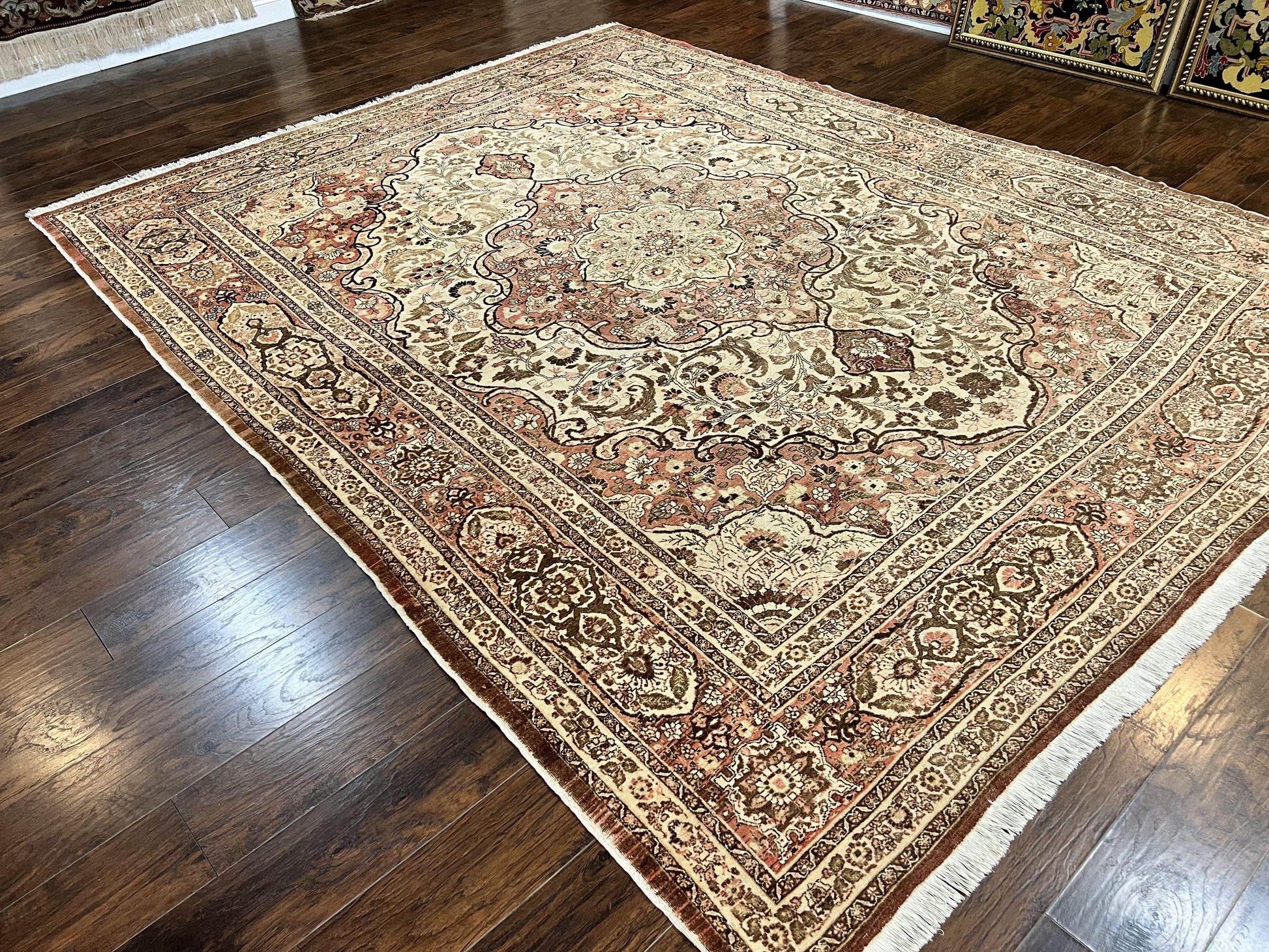 Antique Persian Tabriz Rug 10x12 Hand Knotted Wool Carpet Floral Medallion Beige and Light Red