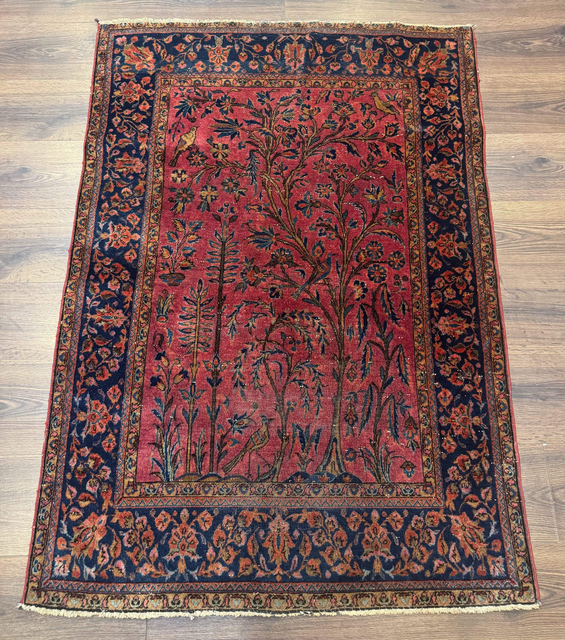 This antique Persian Tree of Life rug, woven in Kashan in the early 20th century, blends timeless symbolism with refined hand-knotted craftsmanship. Made with prized Manchester wool and measuring 3'3" x 4'9", it brings a bold red field, a deep navy border, and a forest of birds and flowering branches to your space.