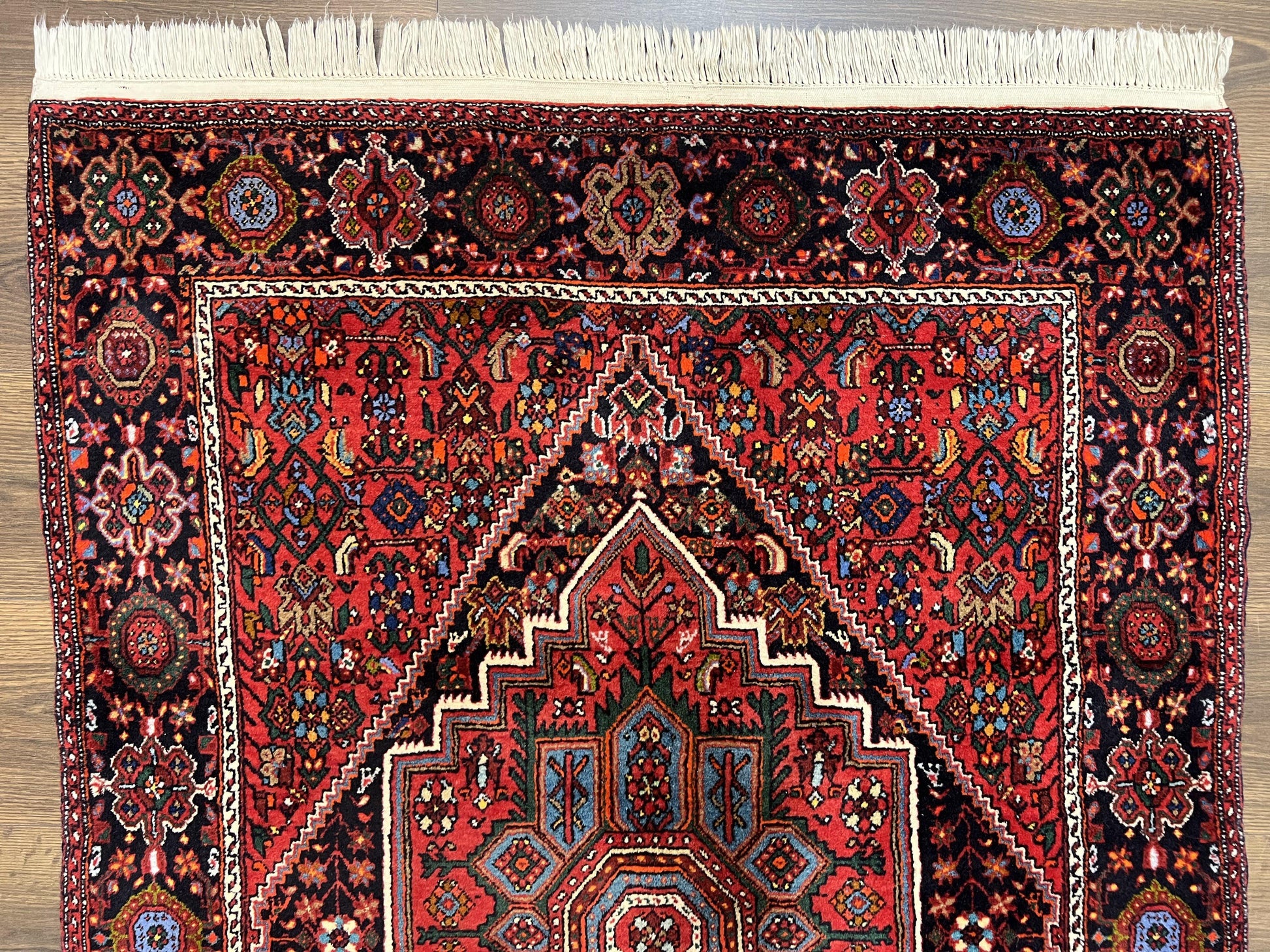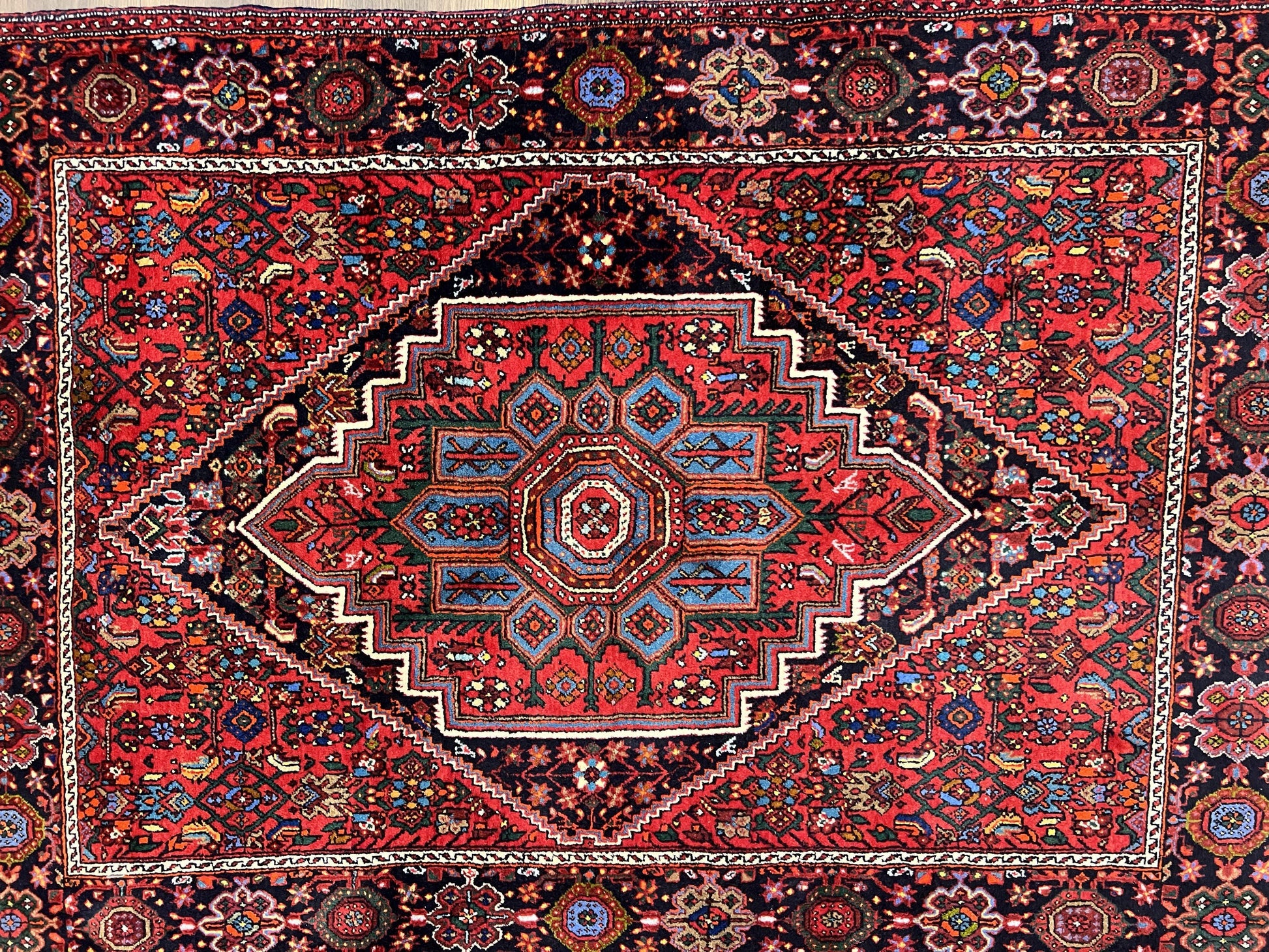 Elevate any room with a vintage Persian Bidjar rug—hand-knotted in wool and finished with a striking geometric medallion in ruby red and black. This semi-antique piece is perfect for design lovers who value artisan craftsmanship and enduring style.
