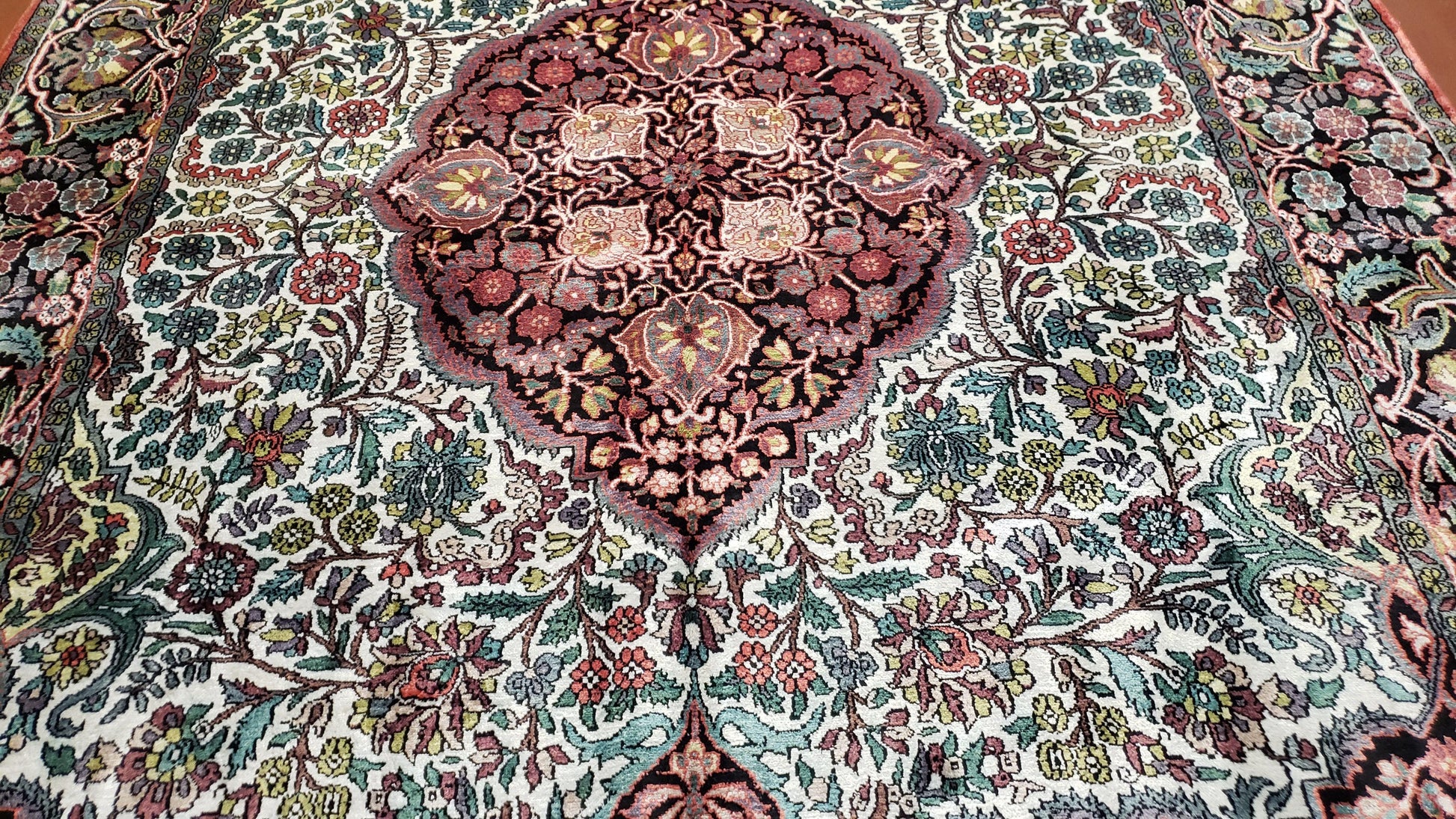 Indian Kashmiri Silk Rug 6x10 Ivory Floral Medallion Hand Knotted