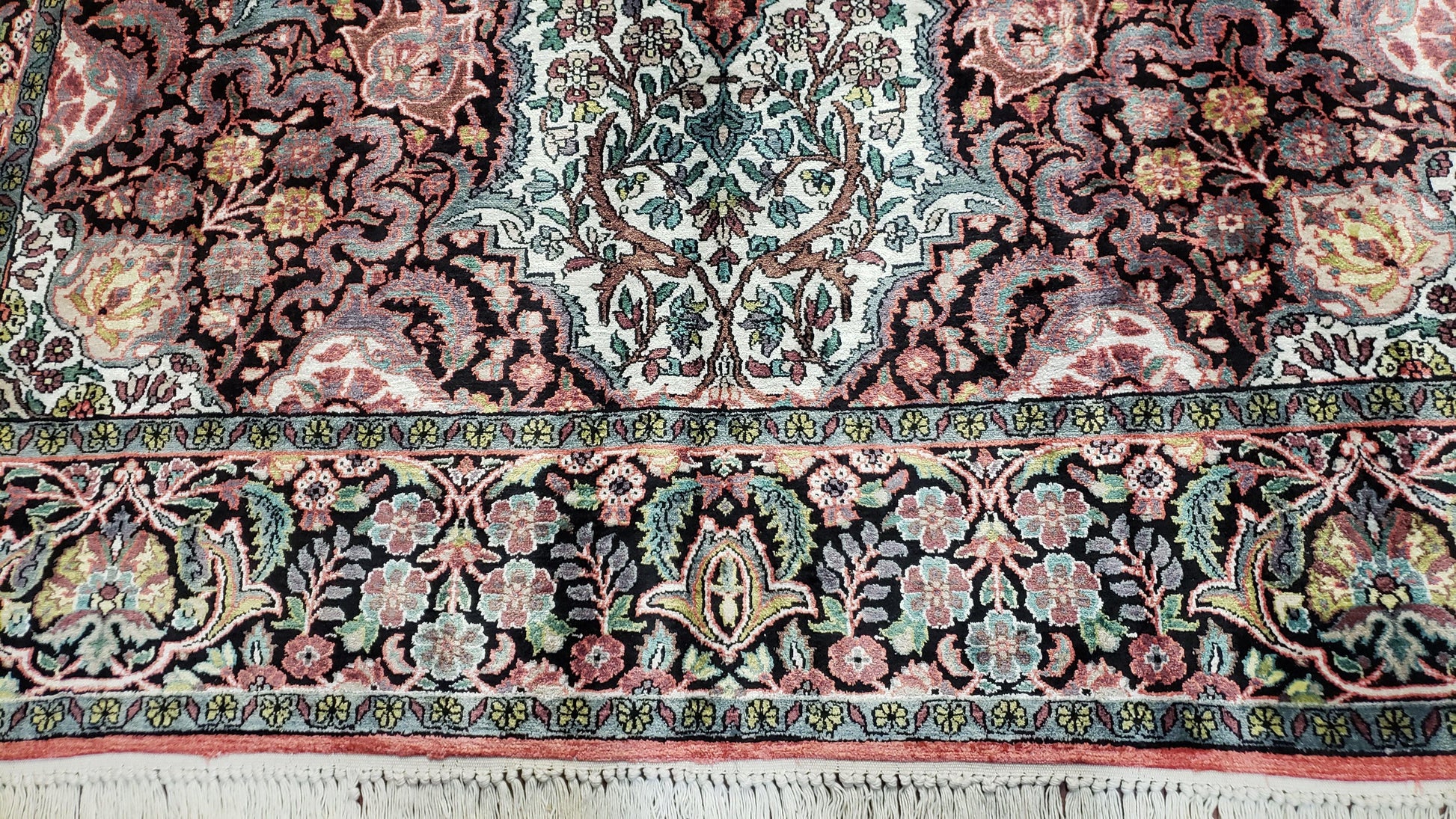 | Condition/Notes | A beautiful, hand-knotted vintage silk rug in great condition. Free of stains, odors, discolorations, tear, etc. Good pile and fringes. Recently professionally cleaned and ready to be enjoyed in your space. |