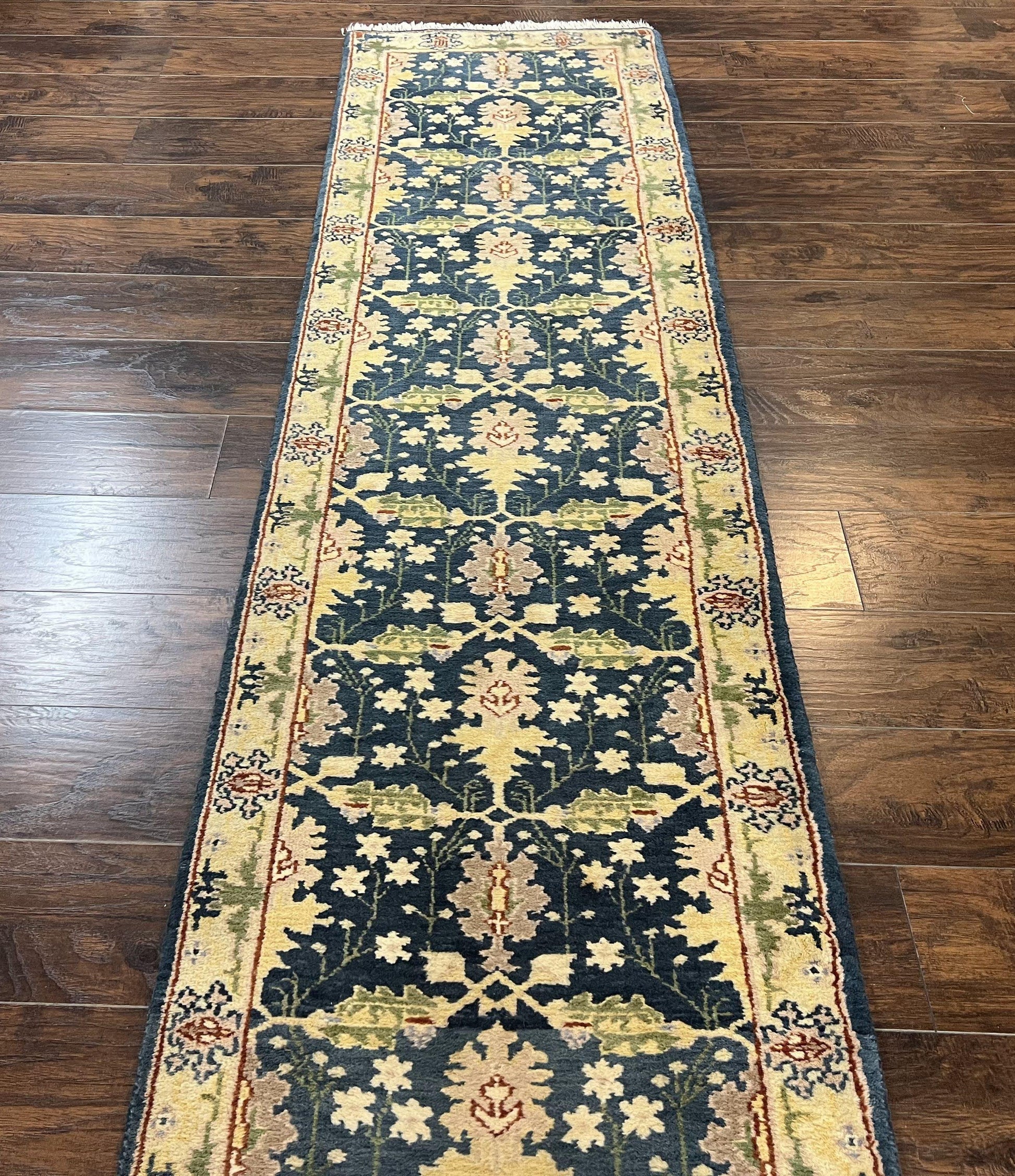 Indo Mahal Wool Hand Knotted Runner Rug 2.6 x 12 Navy Blue Beige Oriental Hallway Rug