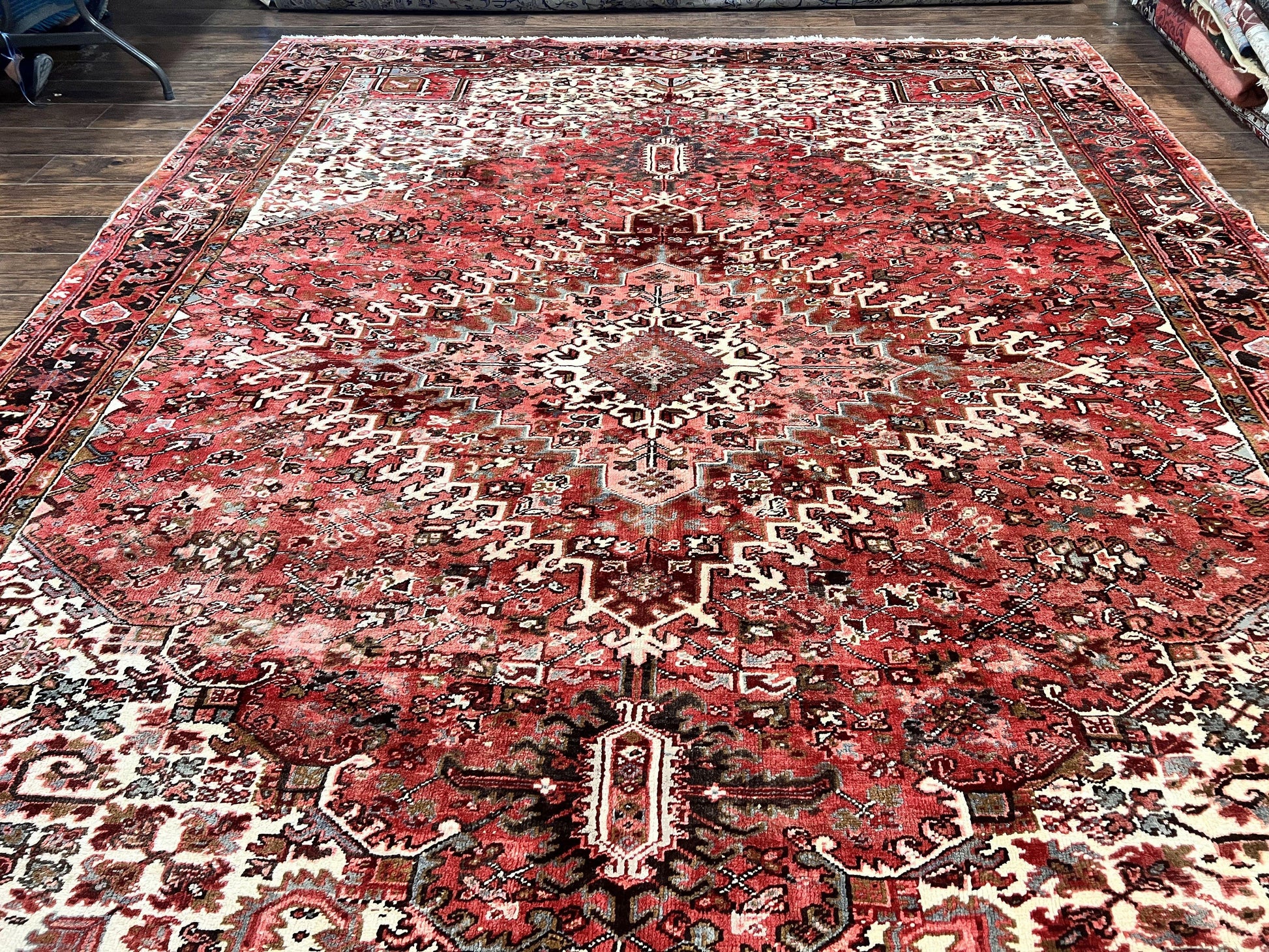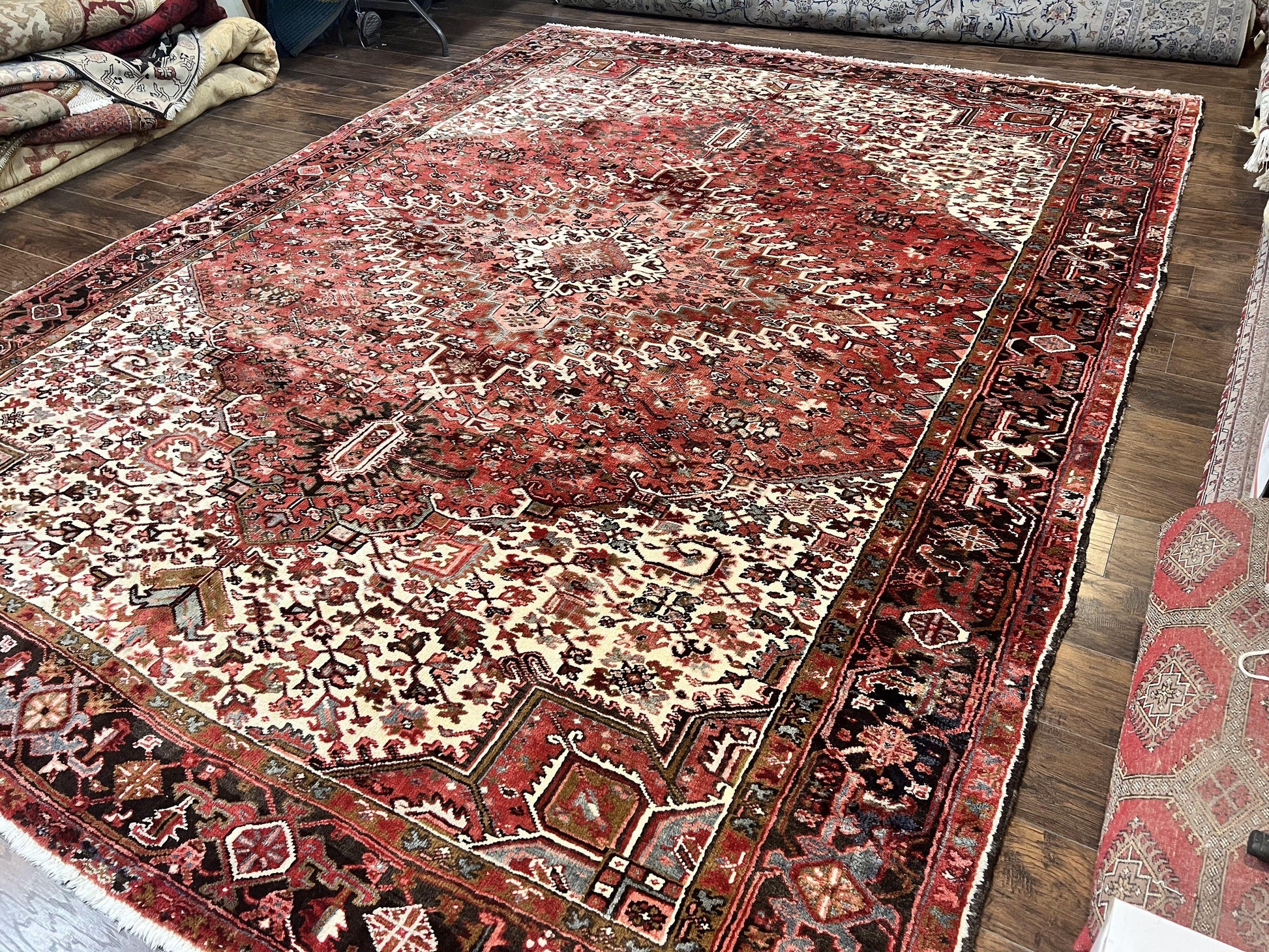 Persian Heriz Rug 10x13 Handmade Wool Hand Knotted Red Cream Geometric Tribal Semi Antique Carpet