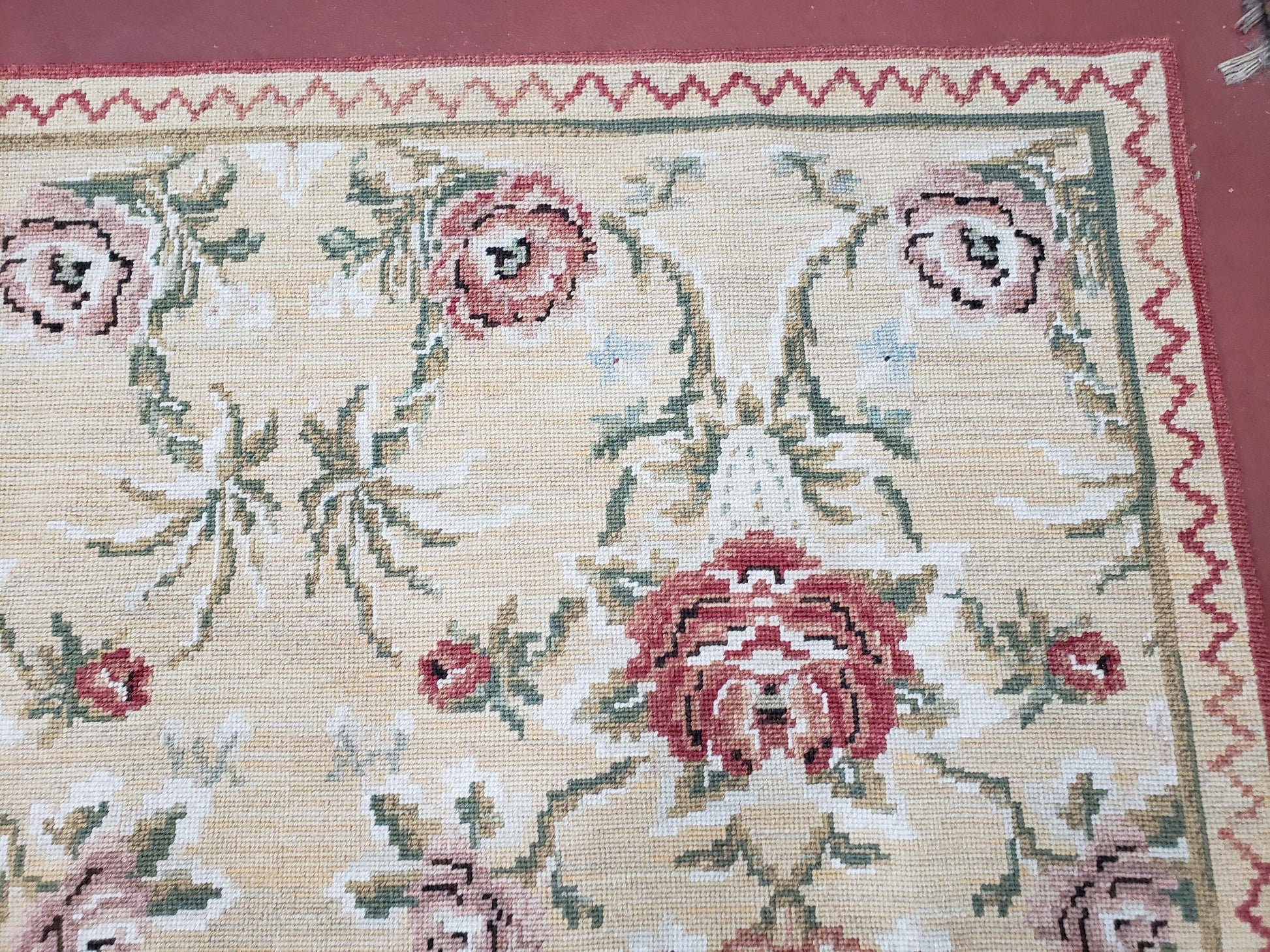 Needlepoint Rug 10x14 Wool Flatweave With English Floral Pattern In Pale Yellow Roses Handmade