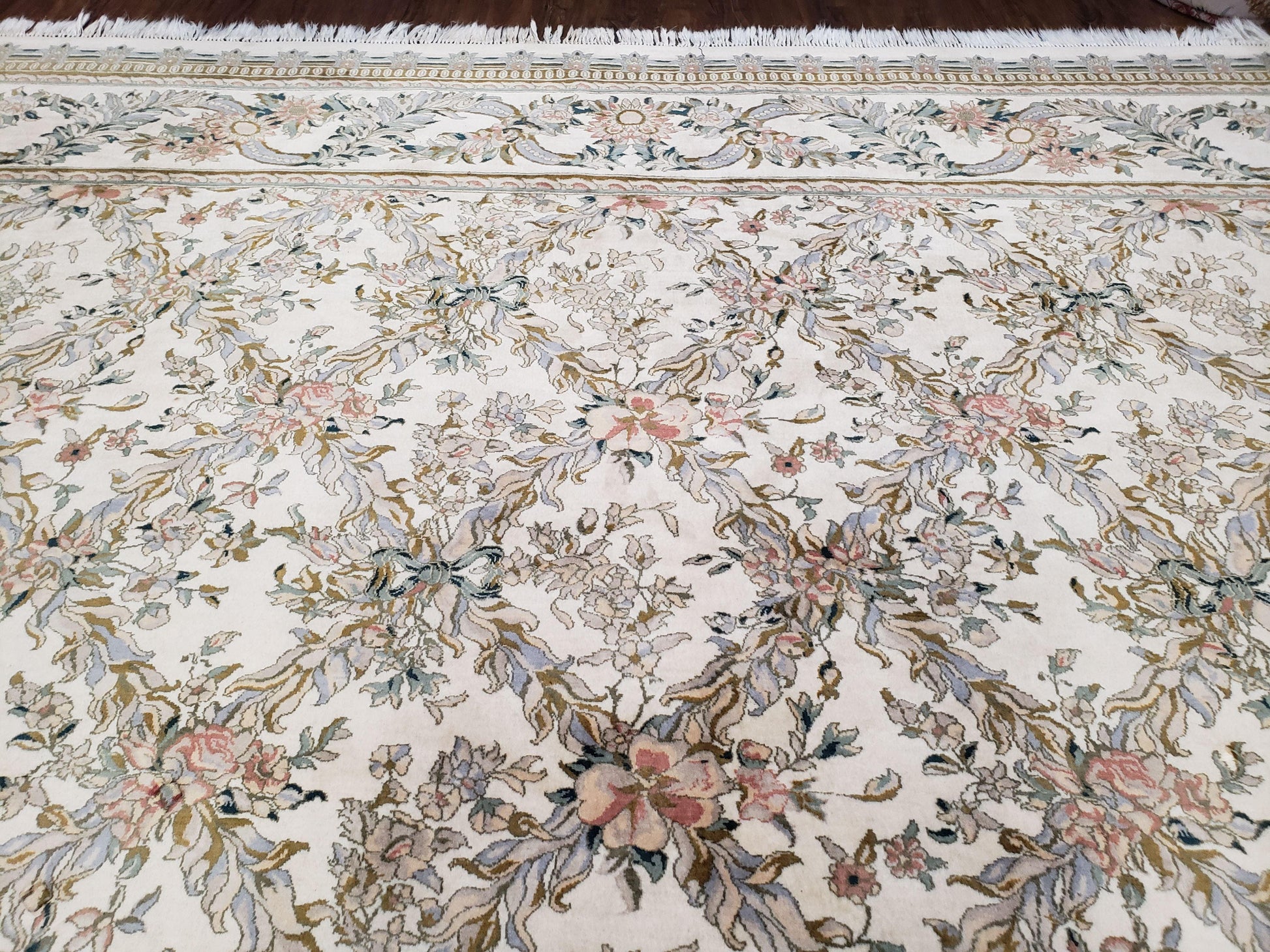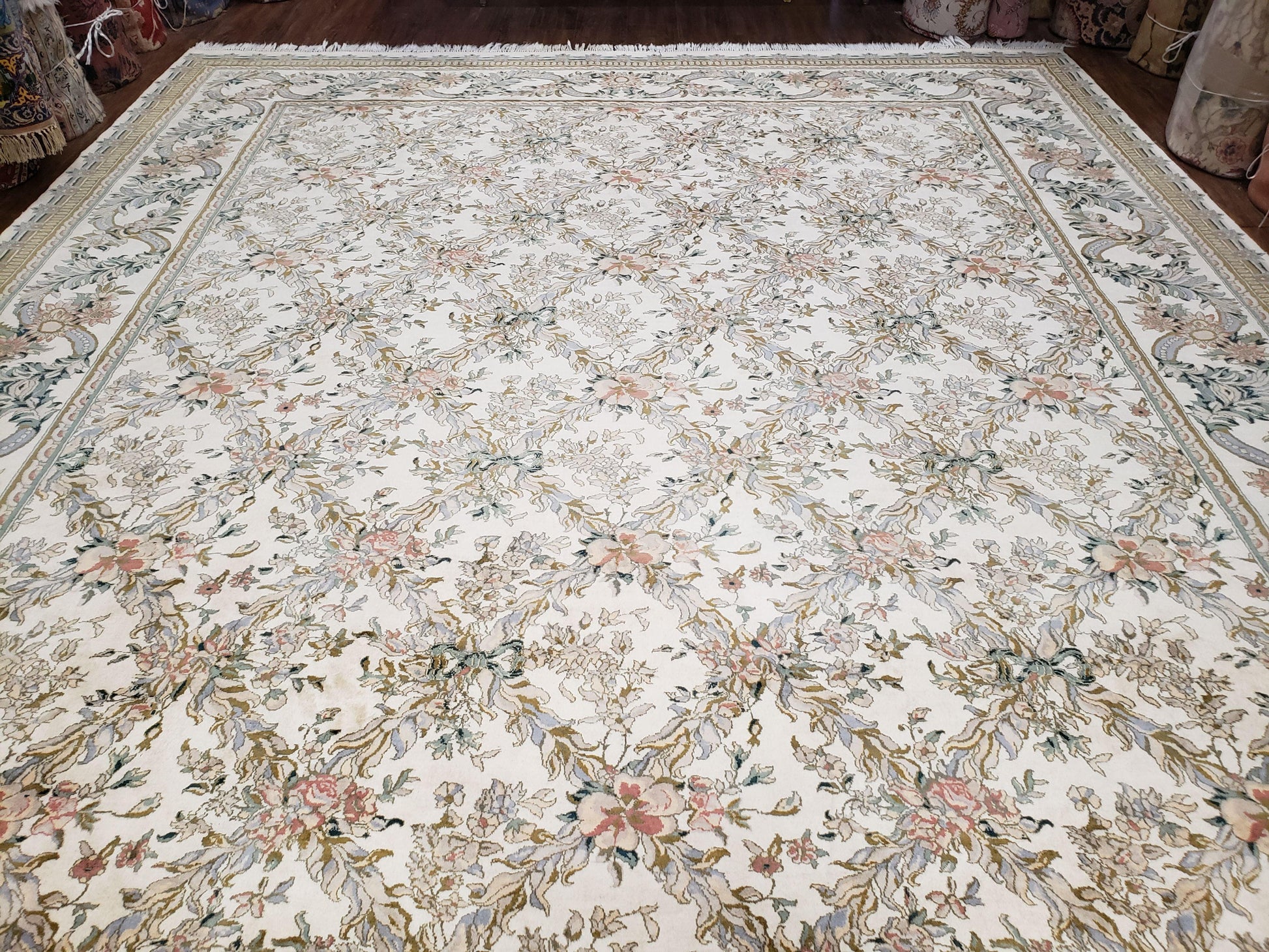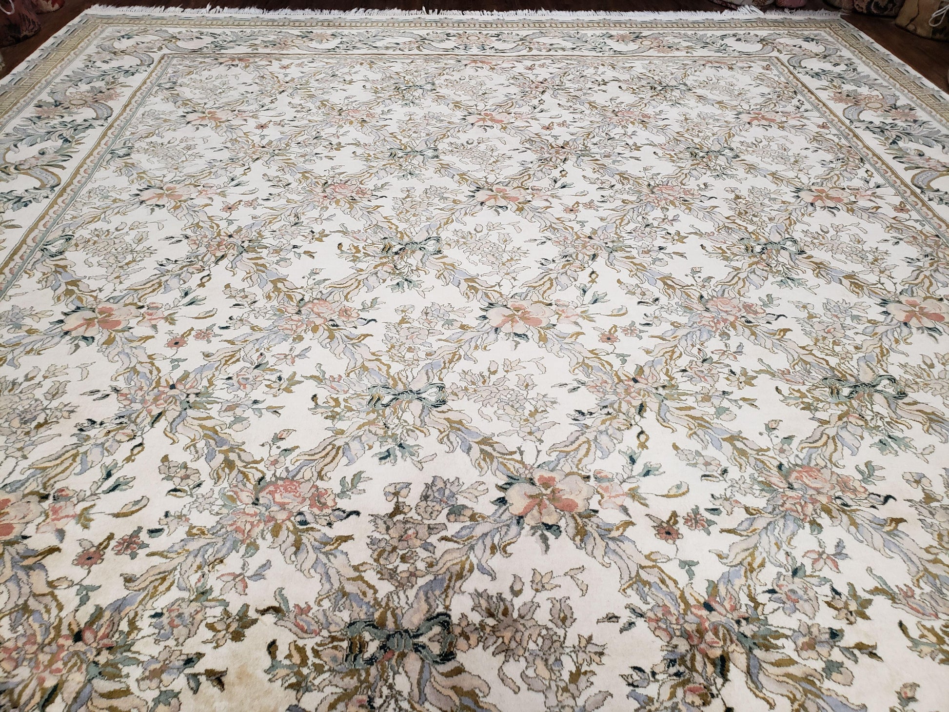 Pak Persian Floral Rug Hand Knotted Wool 11 x 12.6 Ivory Vintage