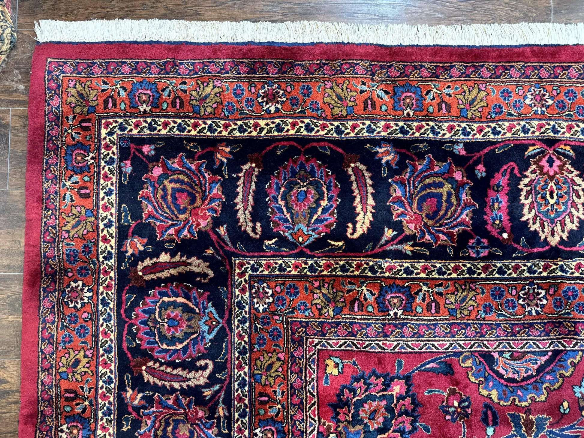 Enhance any formal living area or grand dining room with enduring elegance and presence. The rug’s substantial size creates a striking focal point while grounding furniture arrangements. Its dense wool pile offers durability and a soft, inviting feel underfoot. The master weaver’s signature adds provenance and collectible value, making it a distinguished centerpiece that can be enjoyed for generations. The vibrant raspberry and navy tones provide a timeless palette that complements traditional decor and modern interiors alike.