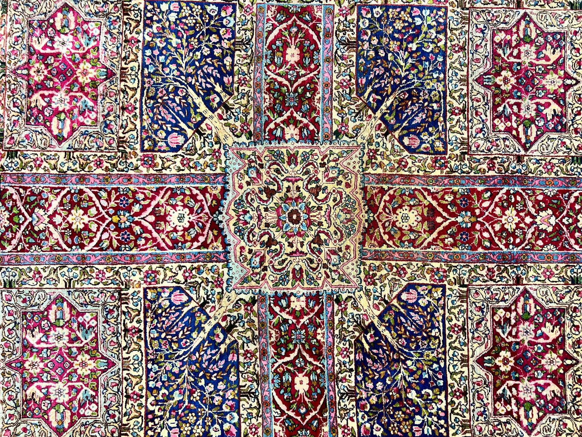 Introducing the Persian Kirman Lavar Rug—a rare antique, handmade hand-knotted wool rug from the 1920s that brings timeless elegance to any room. Crafted in the Persian Kirman tradition with a garden panel floral motif, this multicolor piece blends dark red, navy blue, and cream for a refined, enduring look. Size is about 7'10" x 9'4", making it a substantial centerpiece for living rooms, dining areas, or bedrooms.