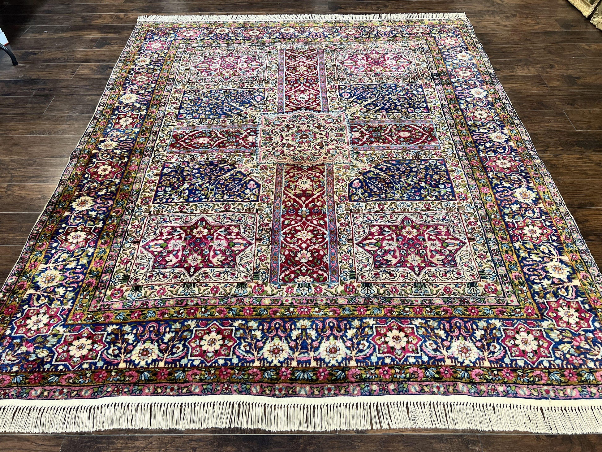 Persian Kirman Lavar Rug 8x9 Handmade Wool Carpet With Antique Floral Garden Panel Design