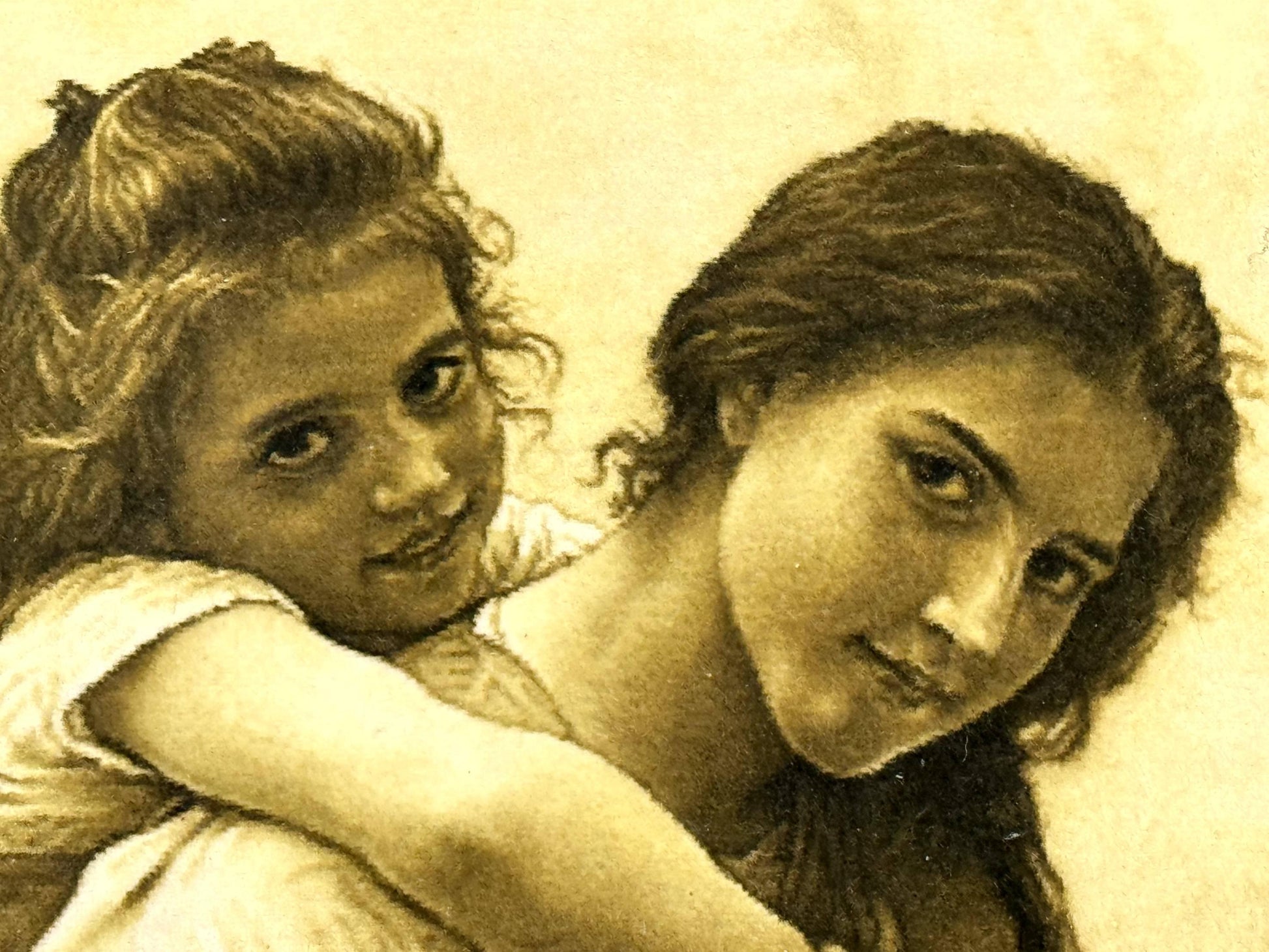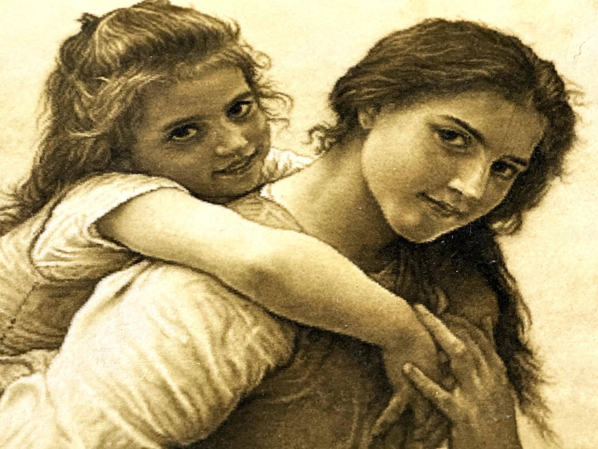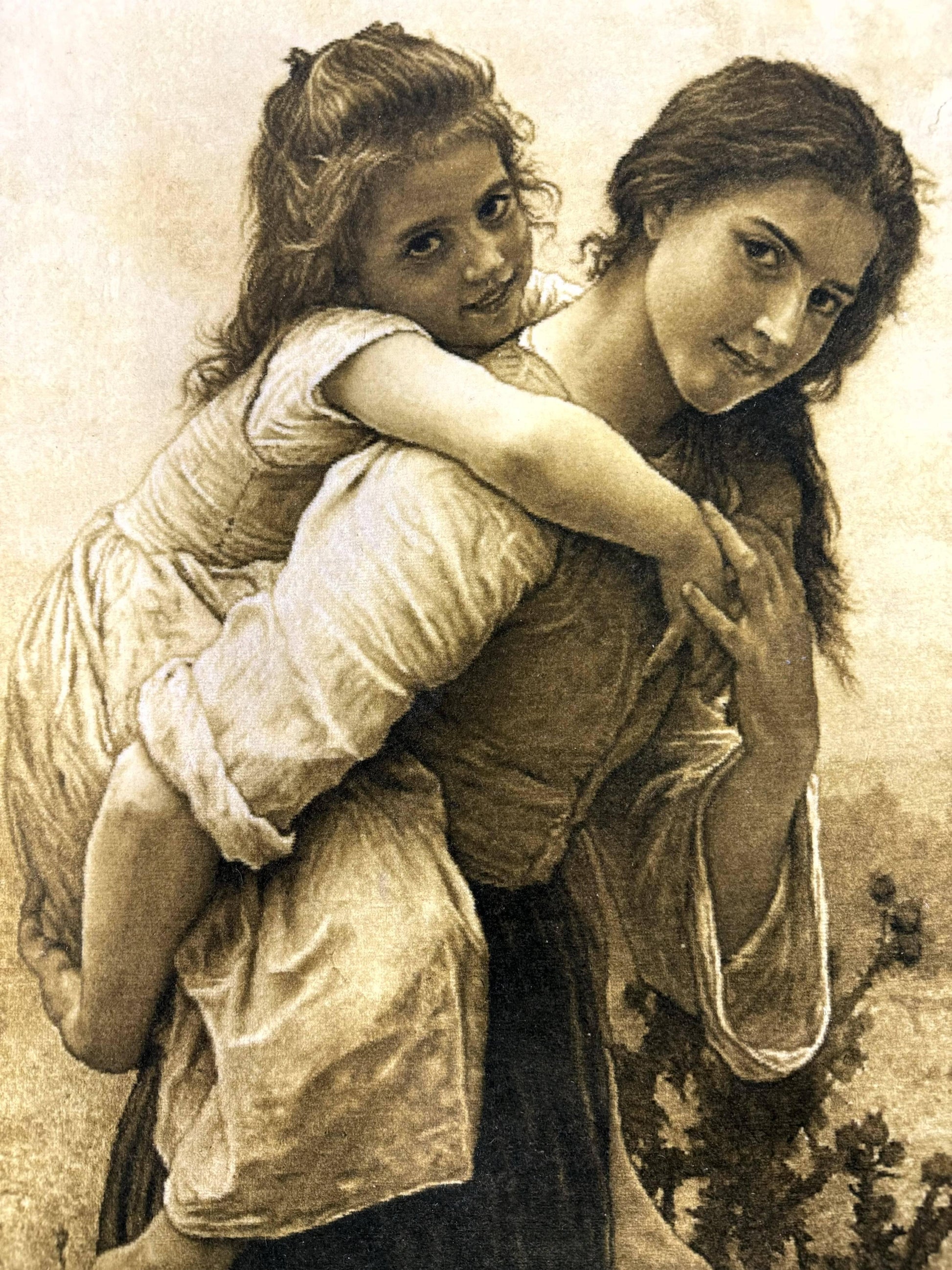 - Design: Pictorial scene depicting a young girl carried on a woman's back with lifelike detail