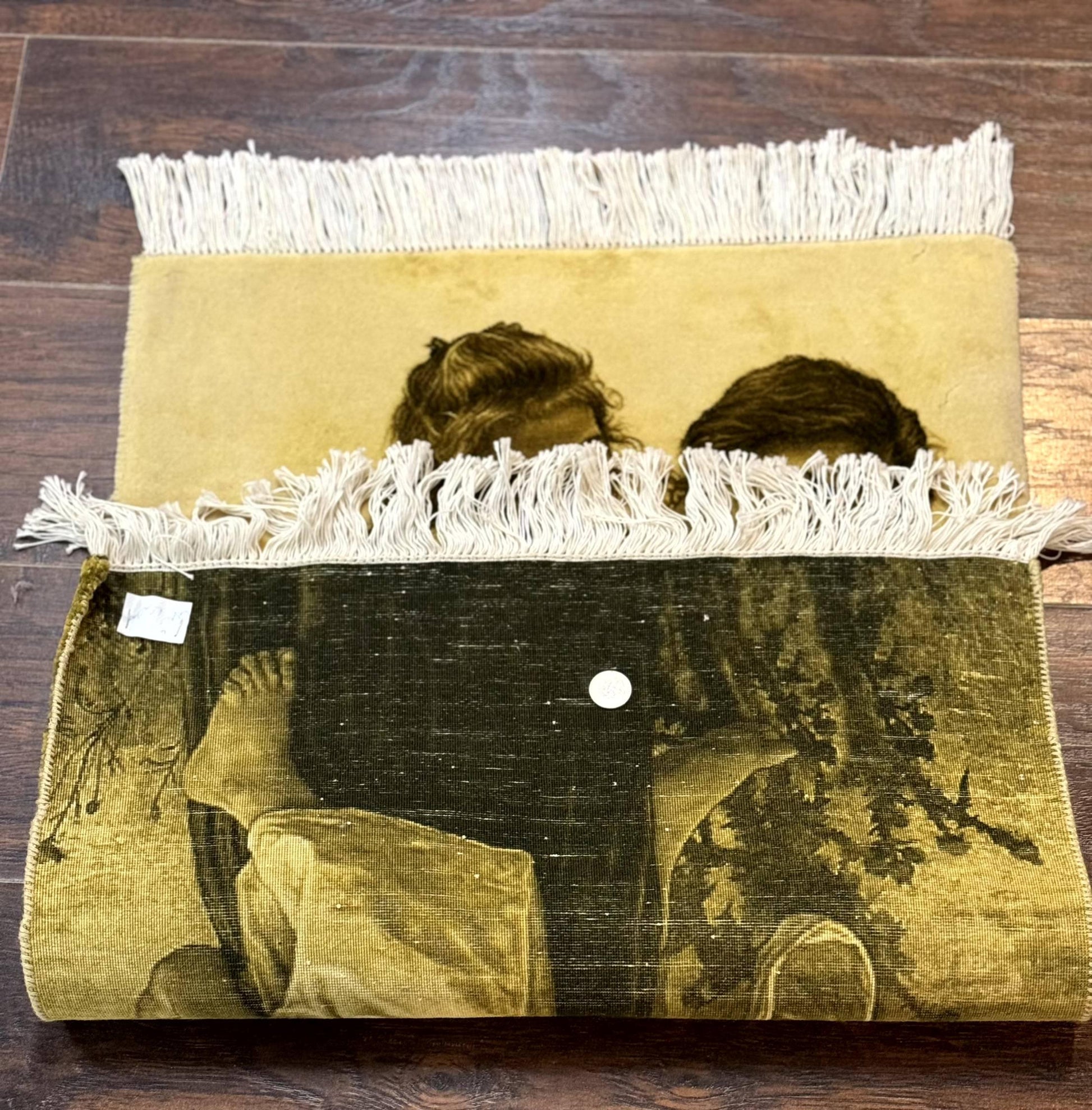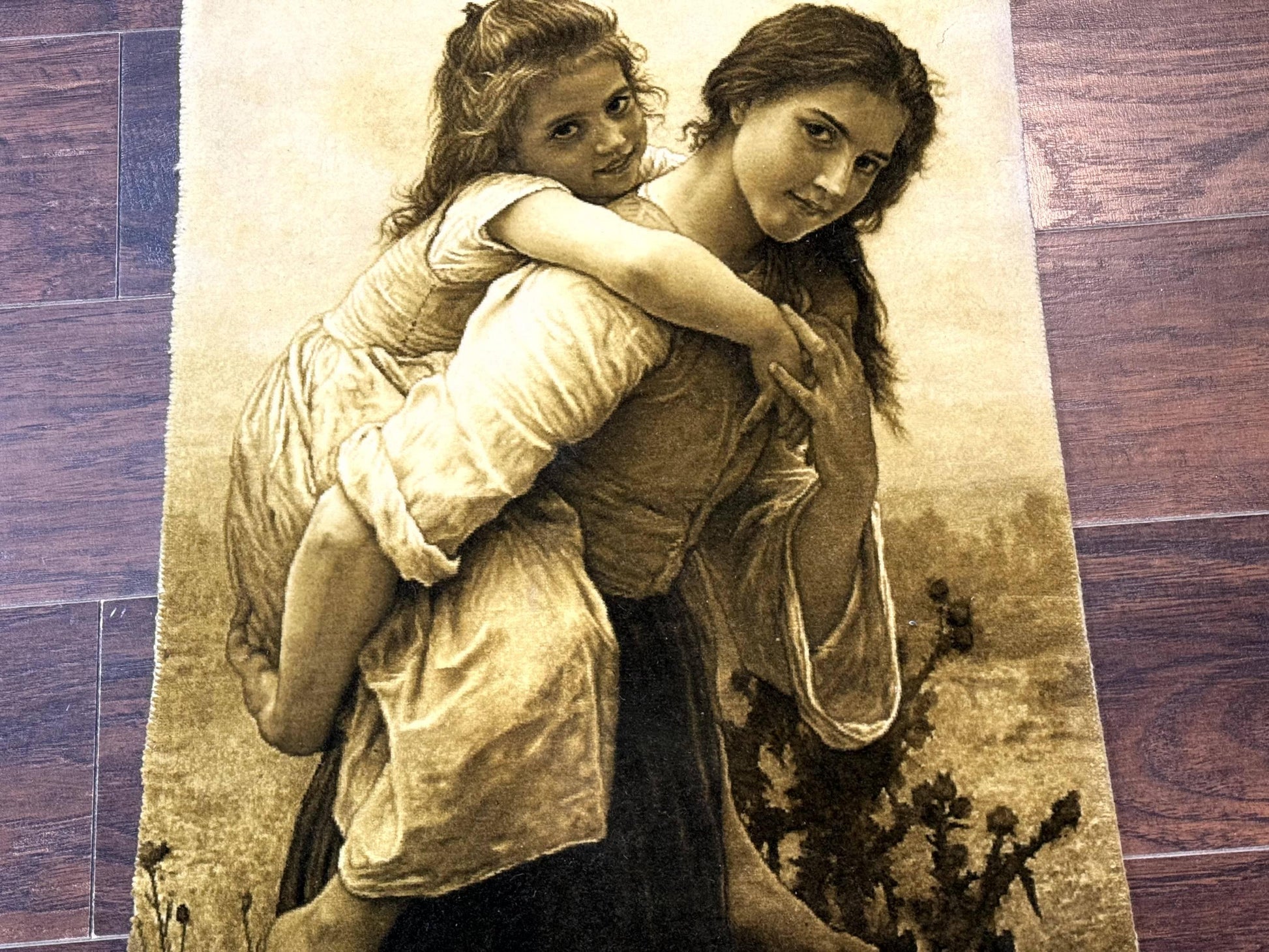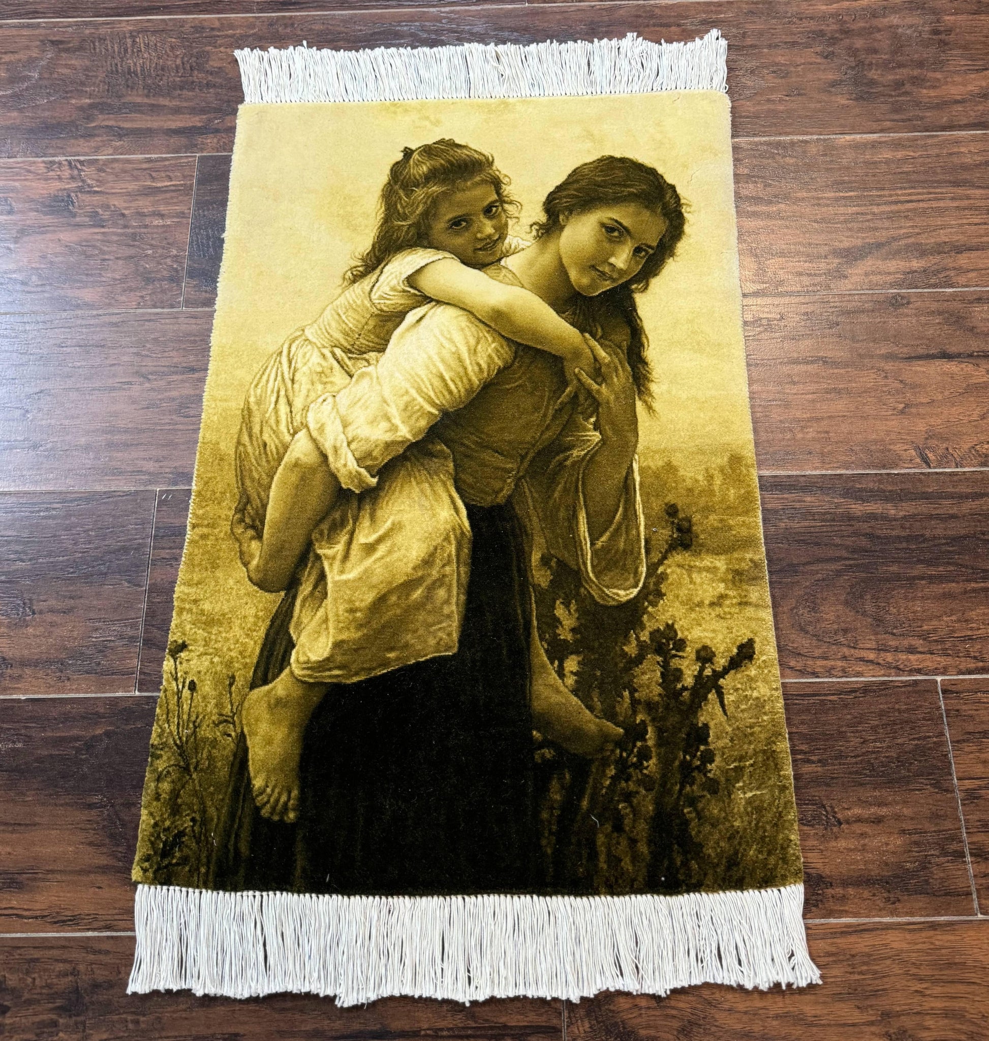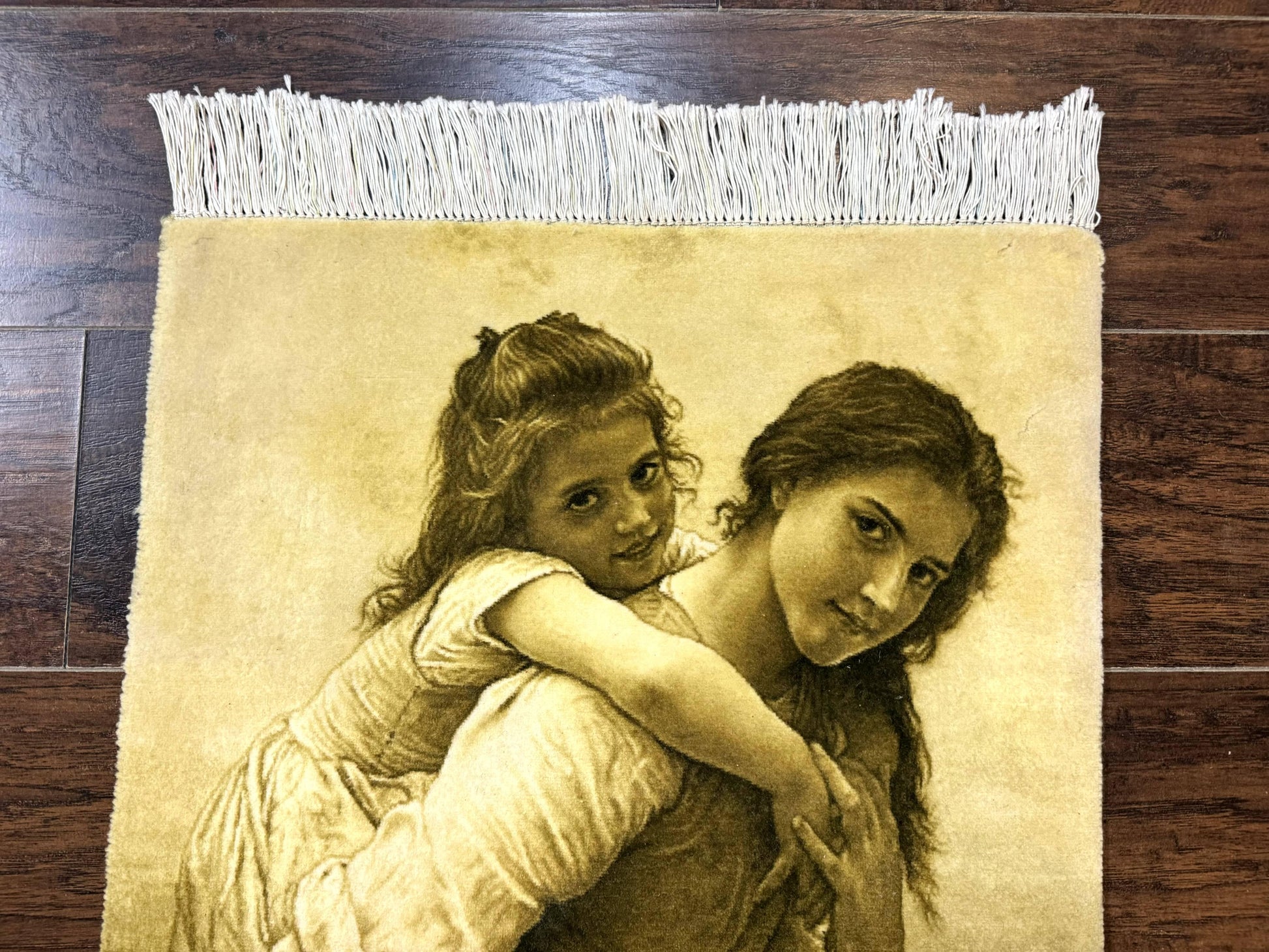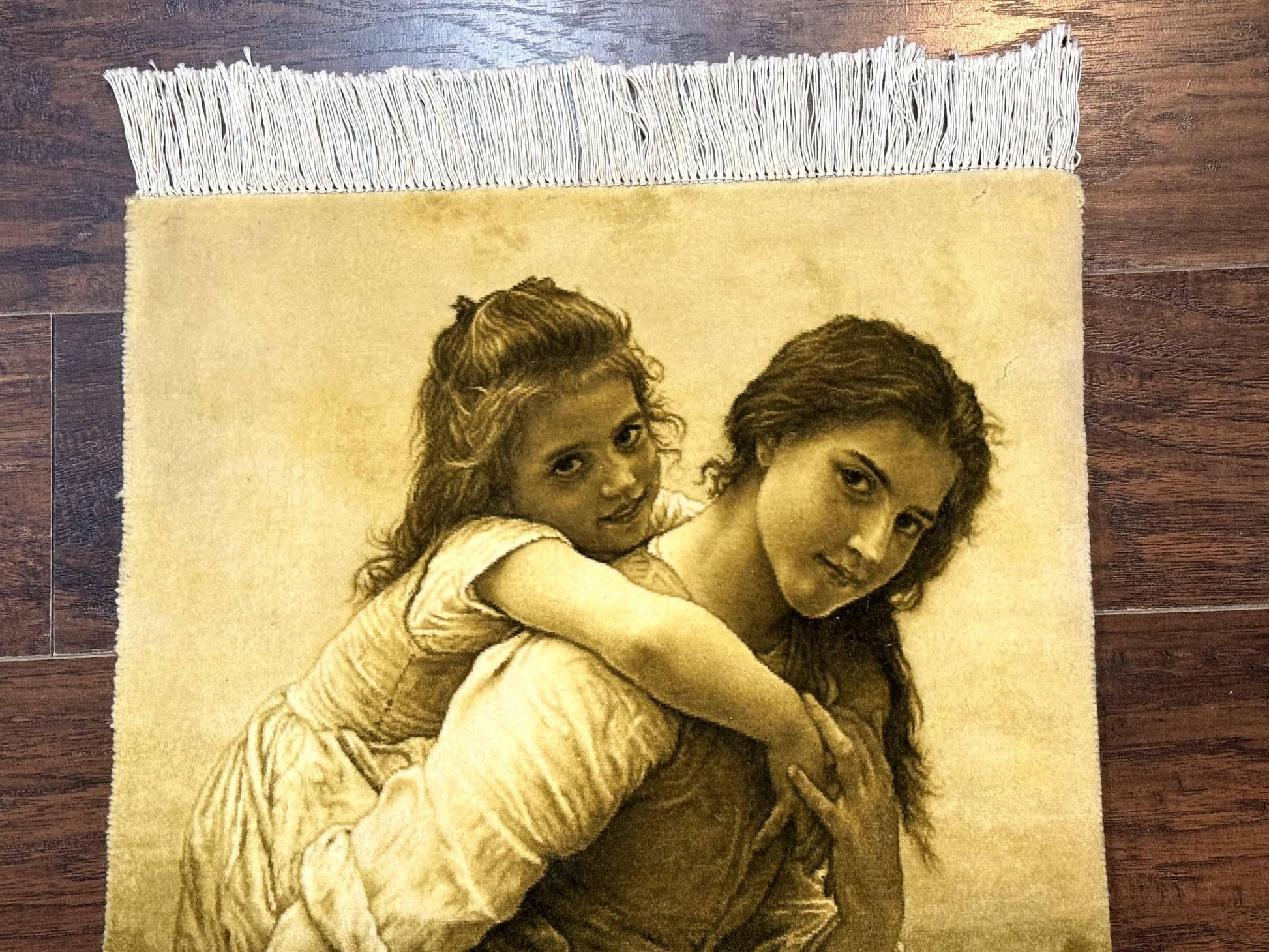 Add character and refinement to your space with this very fine Persian Pictorial Tabriz Rug. Hand-knotted in fine wool, it presents a lifelike scene of a young girl carried on a woman's back in a sepia palette, evoking the feel of 19th-century European portraiture.
