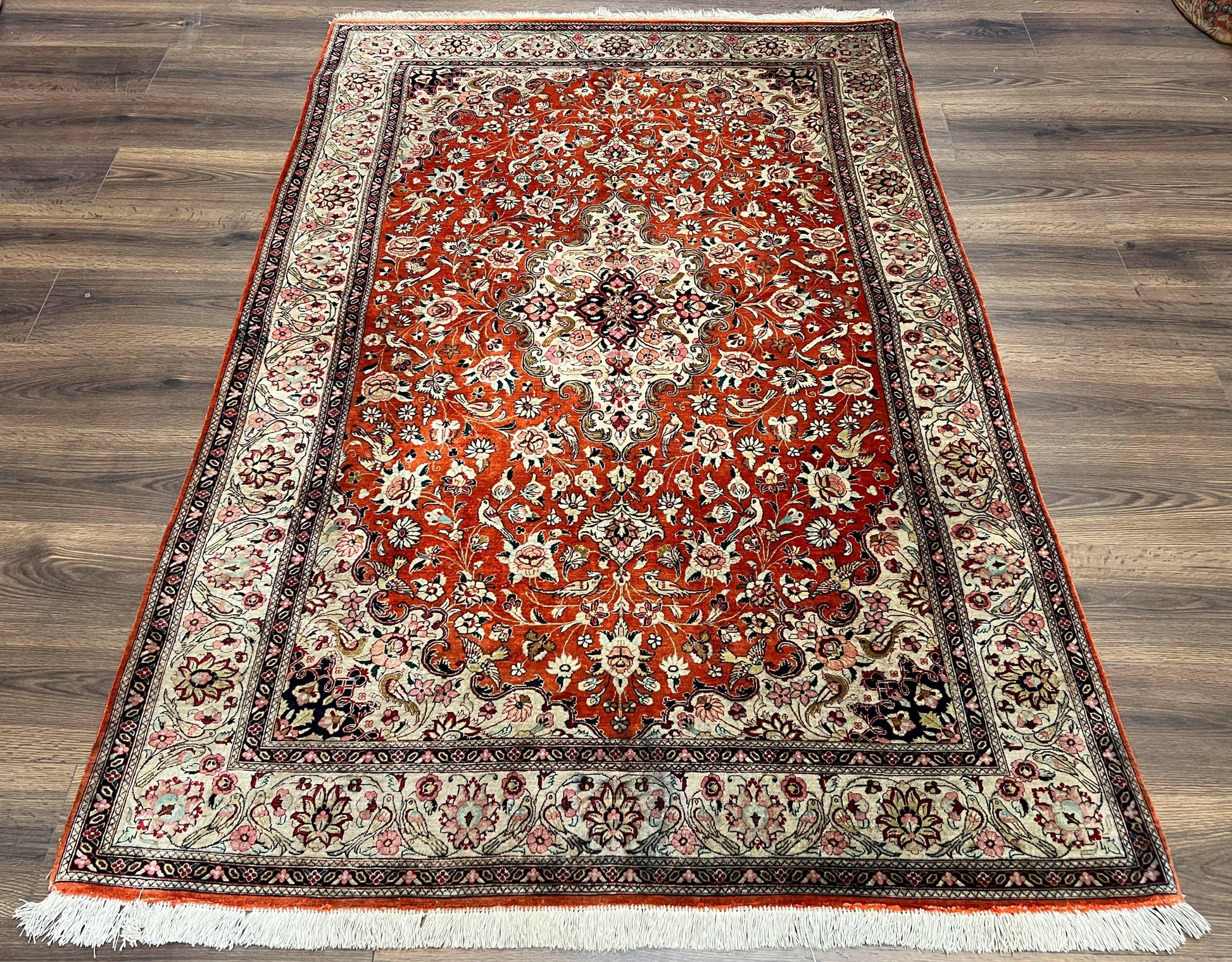 Persian Qum Silk Rug 5x7 Floral Medallion Birds Orange Red Hand Knotted