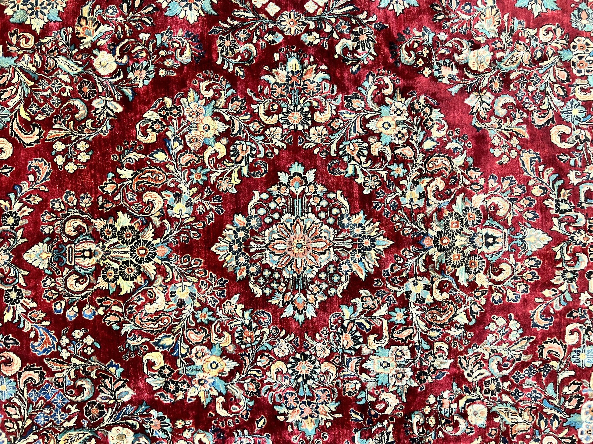 Discover the grace of a Persian Sarouk rug—a rare, hand-knotted wool antique designed for large spaces. Measuring about 12' x 16'8", it features a dark red field with cream detailing and accents of midnight blue, blue, and multicolor to bring timeless floral motifs into your room.