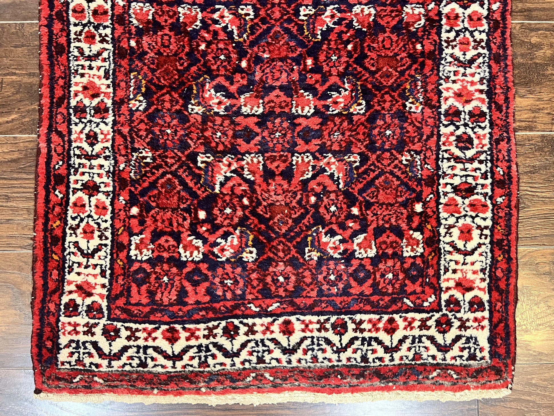 Elevate your space with a vintage Persian Hamadan tribal runner. Hand-knotted in wool, this 9-foot hallway rug offers authentic textile artistry for entryways, galleries, or living areas, featuring a timeless Herati motif in a rich blend of dark blue, ivory, and red.