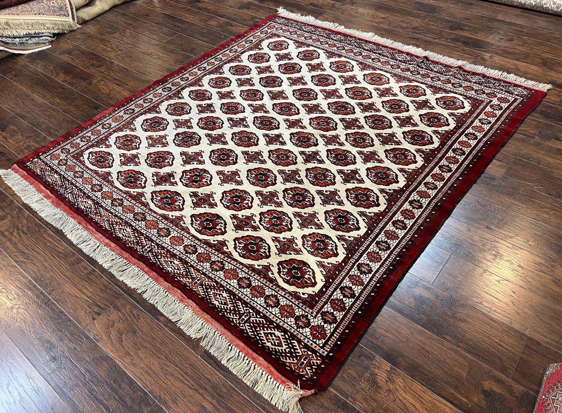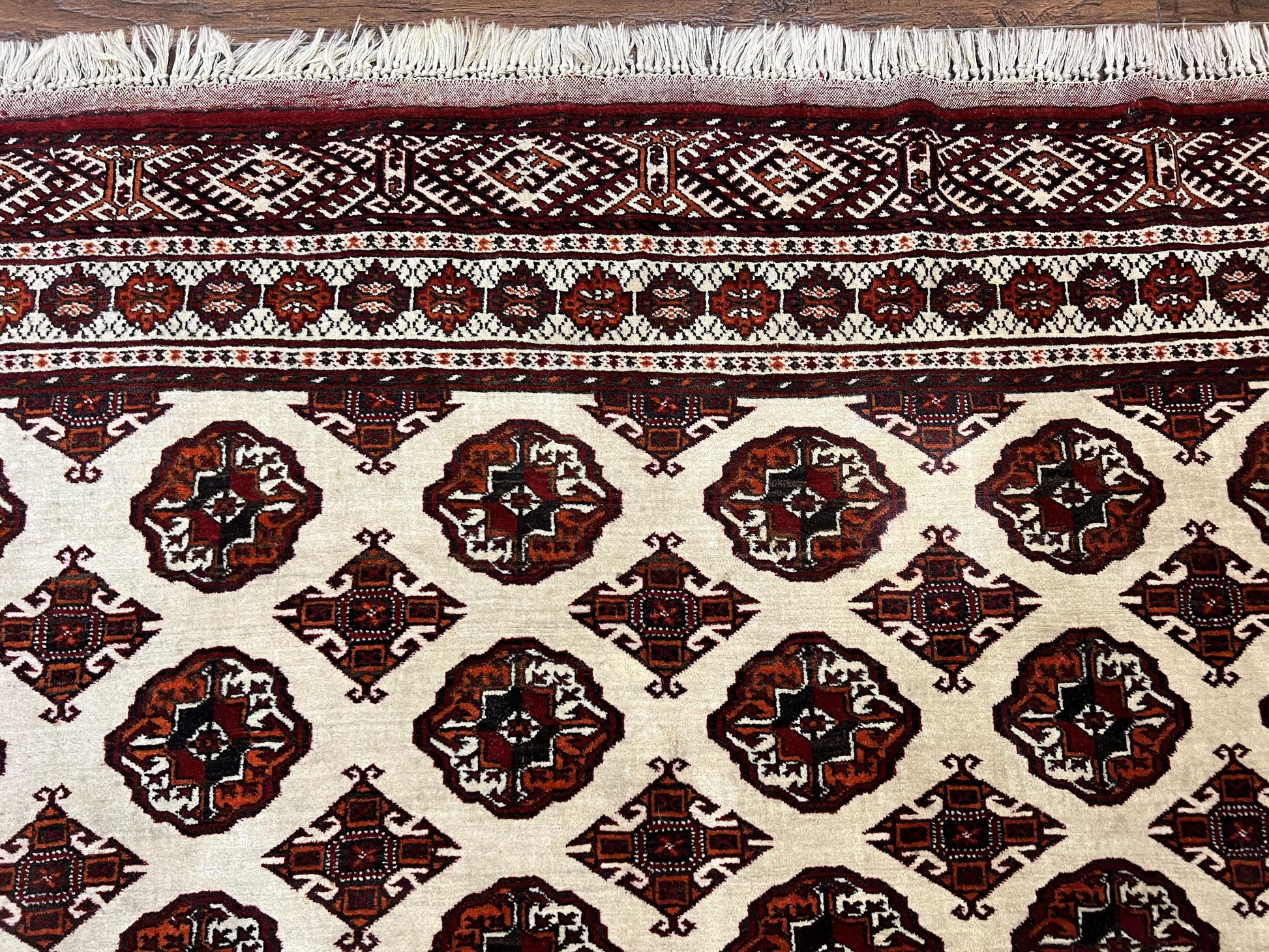 Persian Turkoman Rug Yamud 7x8 Hand Knotted Cream Red Bohemian Tribal Carpet