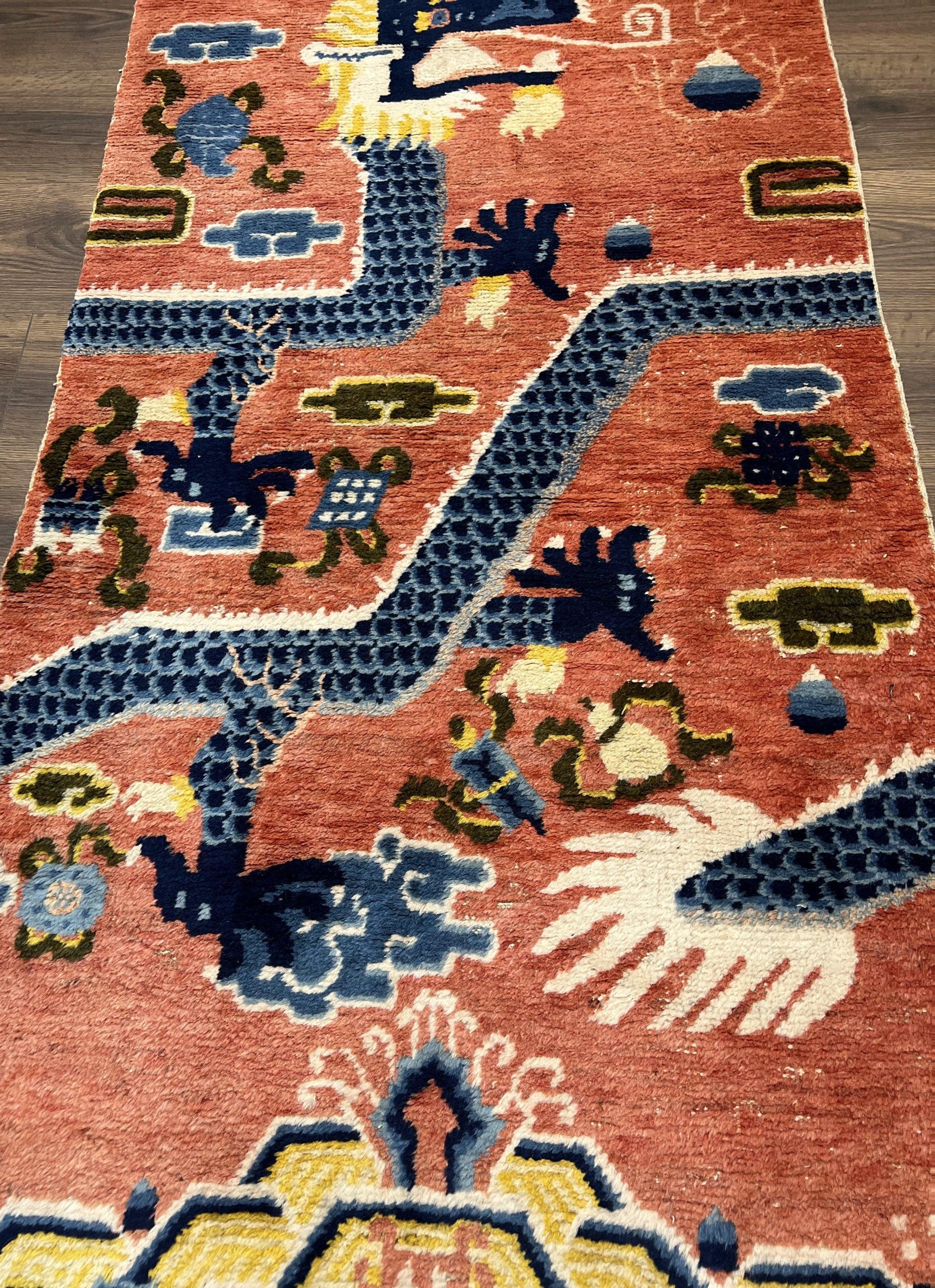 Ningxia Pillar Rug Hand Knotted Wool Carpet Five Clawed Dragon Border Late Qing Dynasty 3x8 Collectible