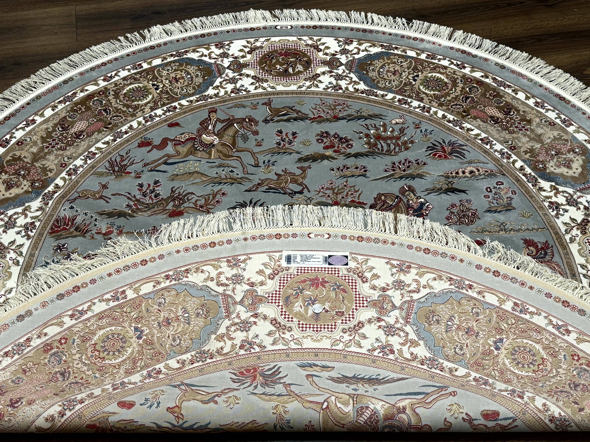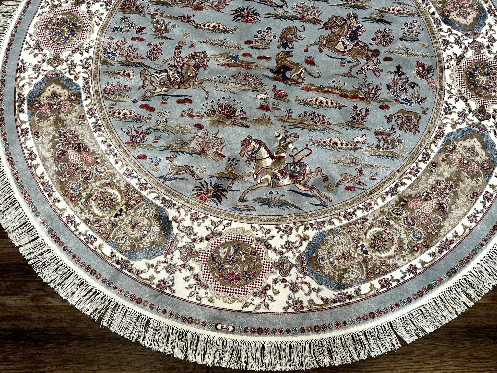 Round Silk Rug 6x6 Bamboo Silk Hunting Design With Animal Pictorials