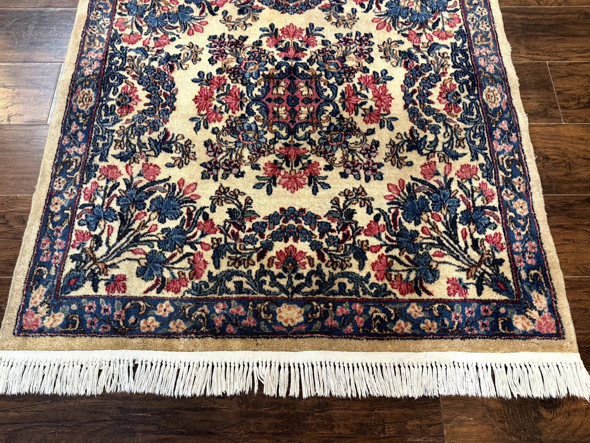 Benefits: The high knot density ensures crisp, intricate patterns that hold up over time, delivering lasting beauty. The soft ivory field paired with blue and pink accents makes this rug versatile enough to complement a range of interiors—from traditional to modern—while adding warmth to the room. At 4' x 4', it fits well in small living spaces, entryways, or as a refined accent under furniture, and its hand-knotted wool construction offers durability and a cozy underfoot feel. With its vintage Persian Kerman motif and recently refreshed condition, this rug brings both historical charm and everyday usability to your space.