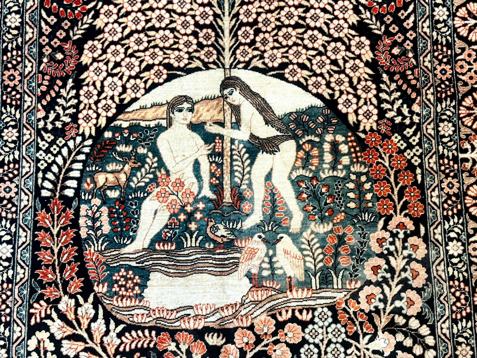 | Condition/Notes | Very good condition. Highly unique design depicting. Adam and Eve and the snake in the Garden of Eden. Extremely fine, with a knot density of 580 KPSI. Free of stains, odors, discolorations, tears, etc. Recently cleaned and ready to be enjoyed in your space. A very wonderful piece. |