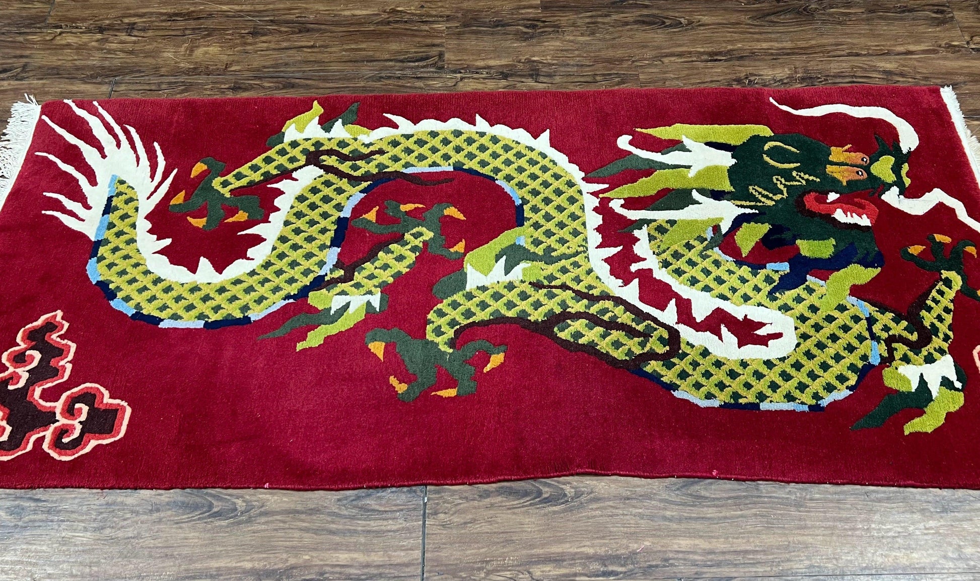 | Condition/Notes | A beautiful vintage Chinese rug in very good condition. Features a unique design of a dragon. Free of stains, odors, discolorations, tears, etc. Good pile & fringes. Recently cleaned and ready to be enjoyed in your space. |