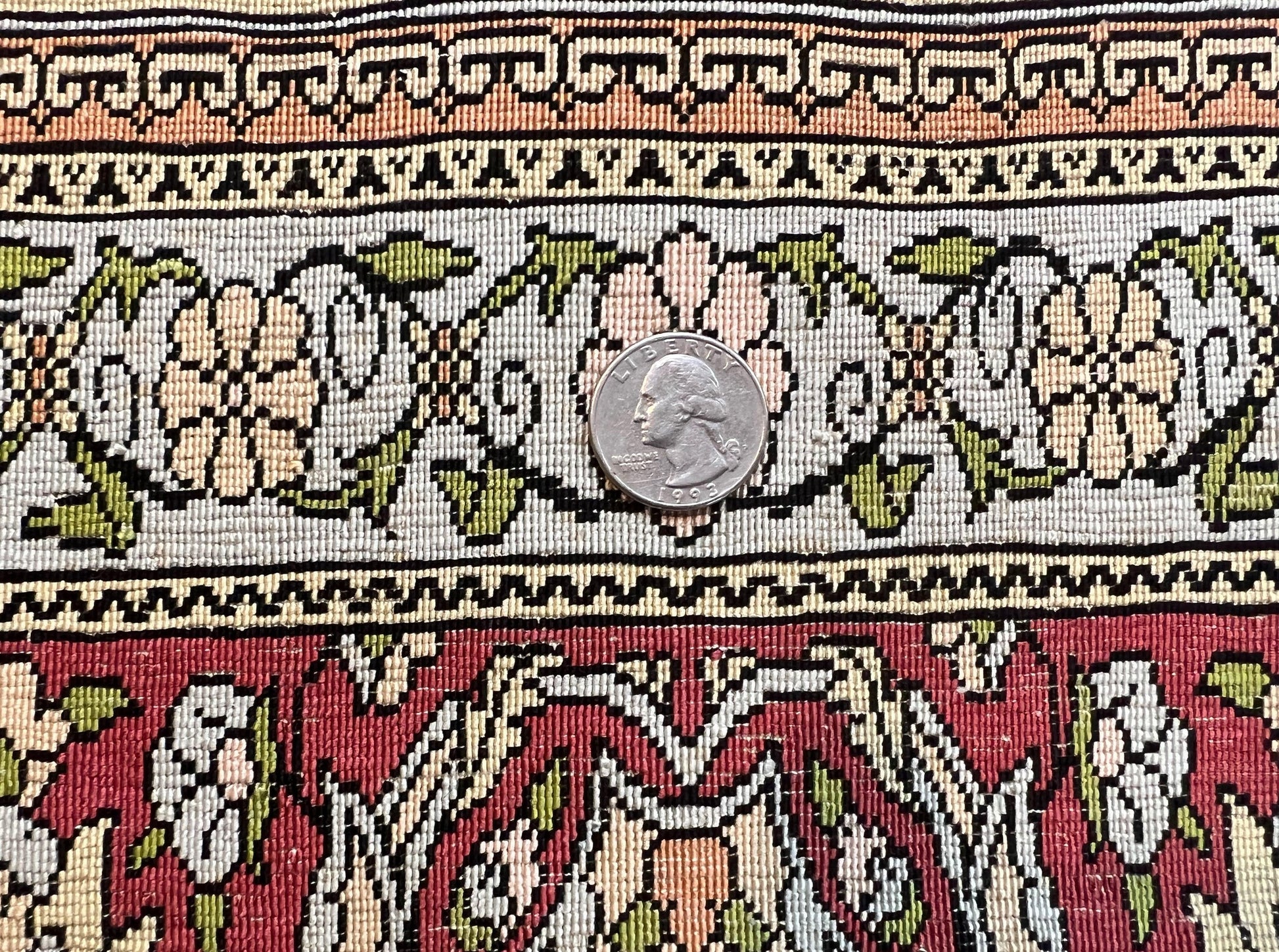 | Condition/Notes | A beautiful vintage silk Turkish Hereke prayer rug in very good condition. A true master piece and extermely fine, has a KPSI of approximately 625 knots per square inch. Features a signature from a master weaver. Free of stains, odors, discolorations, tears, etc. Good pile & fringes. Recently cleaned and ready to be enjoyed in your space. |