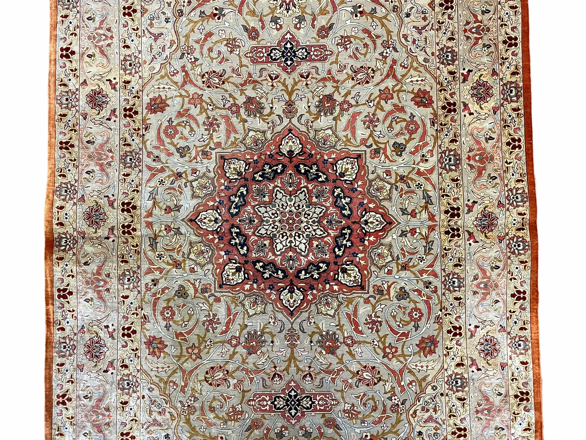 Discover a timeless centerpiece with this vintage handmade Turkish silk rug. Hand-knotted in Turkey during the 1970s, it features a warm beige and red palette and a refined silk weave that brings subtle shine and lasting character to any space.