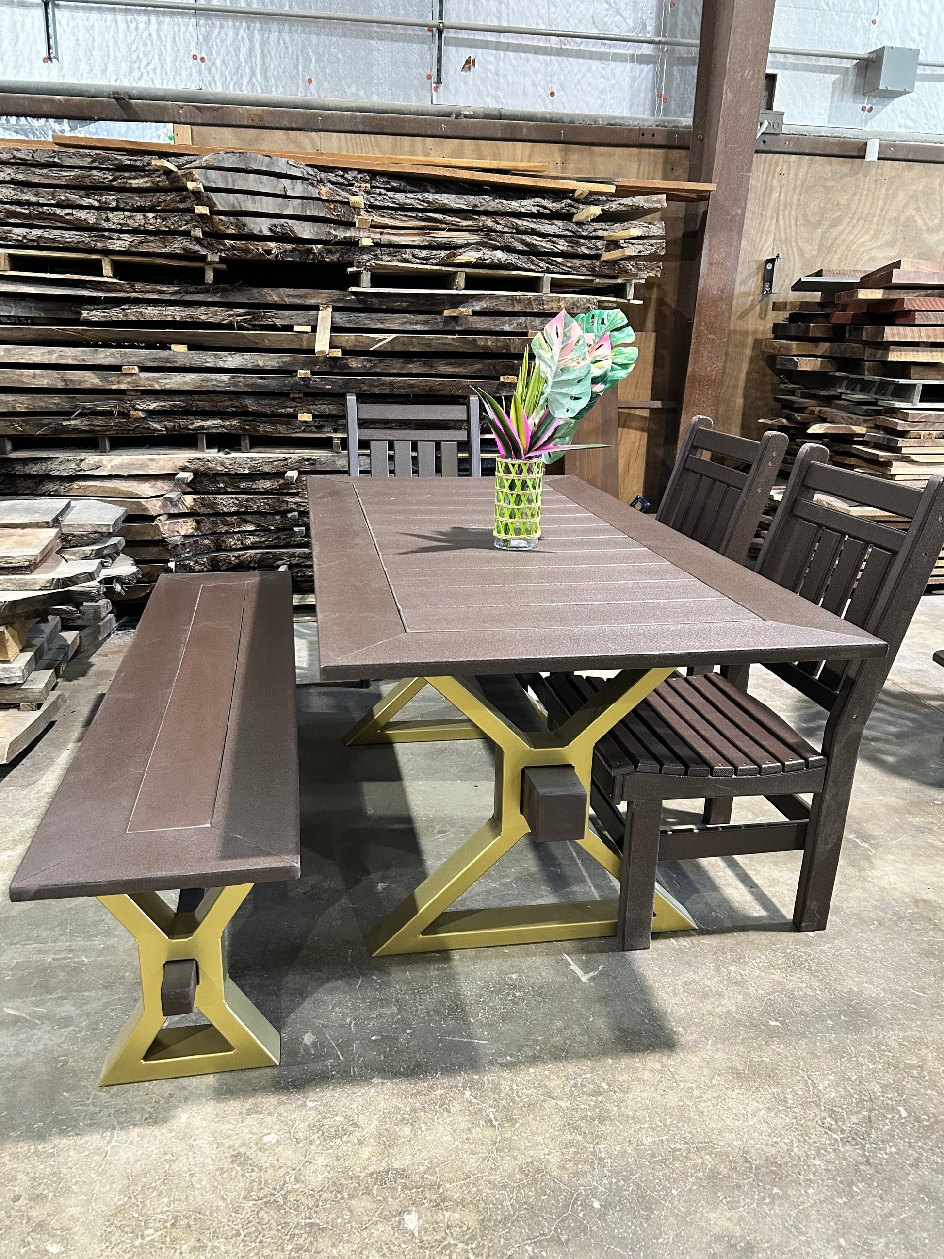 The Metal X Beam Outdoor Dining Table blends a durable poly top with a bold X-shaped leg design, creating a contemporary centerpiece for any patio. Perfect for outdoor entertaining, it offers stylish customization to fit your space.