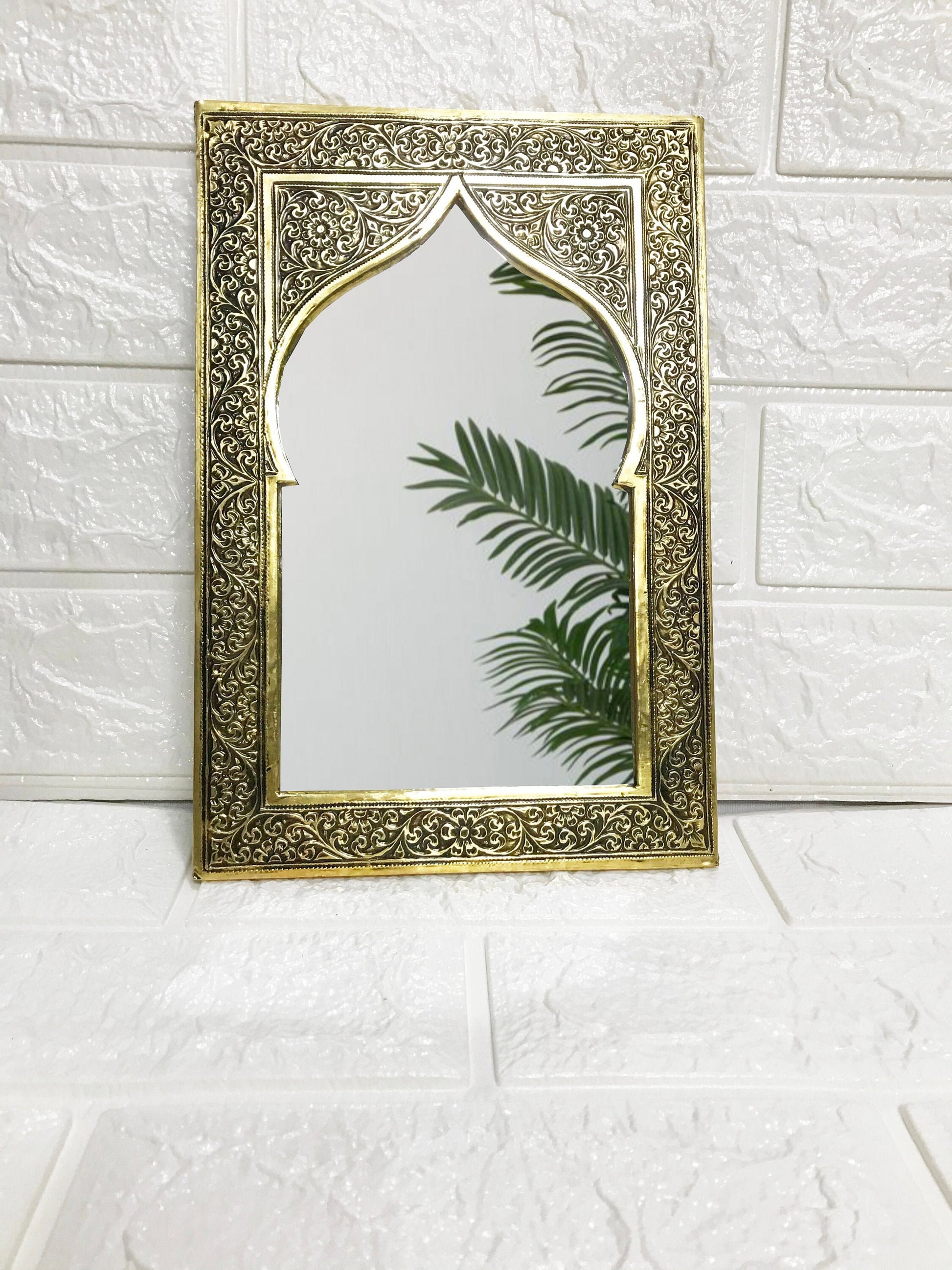 Ce superbe miroir ravissant est fabriqué à la main par nos artisans marocains hautement qualifiés dans notre atelier de Marrakech, entouré de laiton ou de métal. La finition dorée élégante se démarque vraiment, rendant n'importe quel mur incroyable !