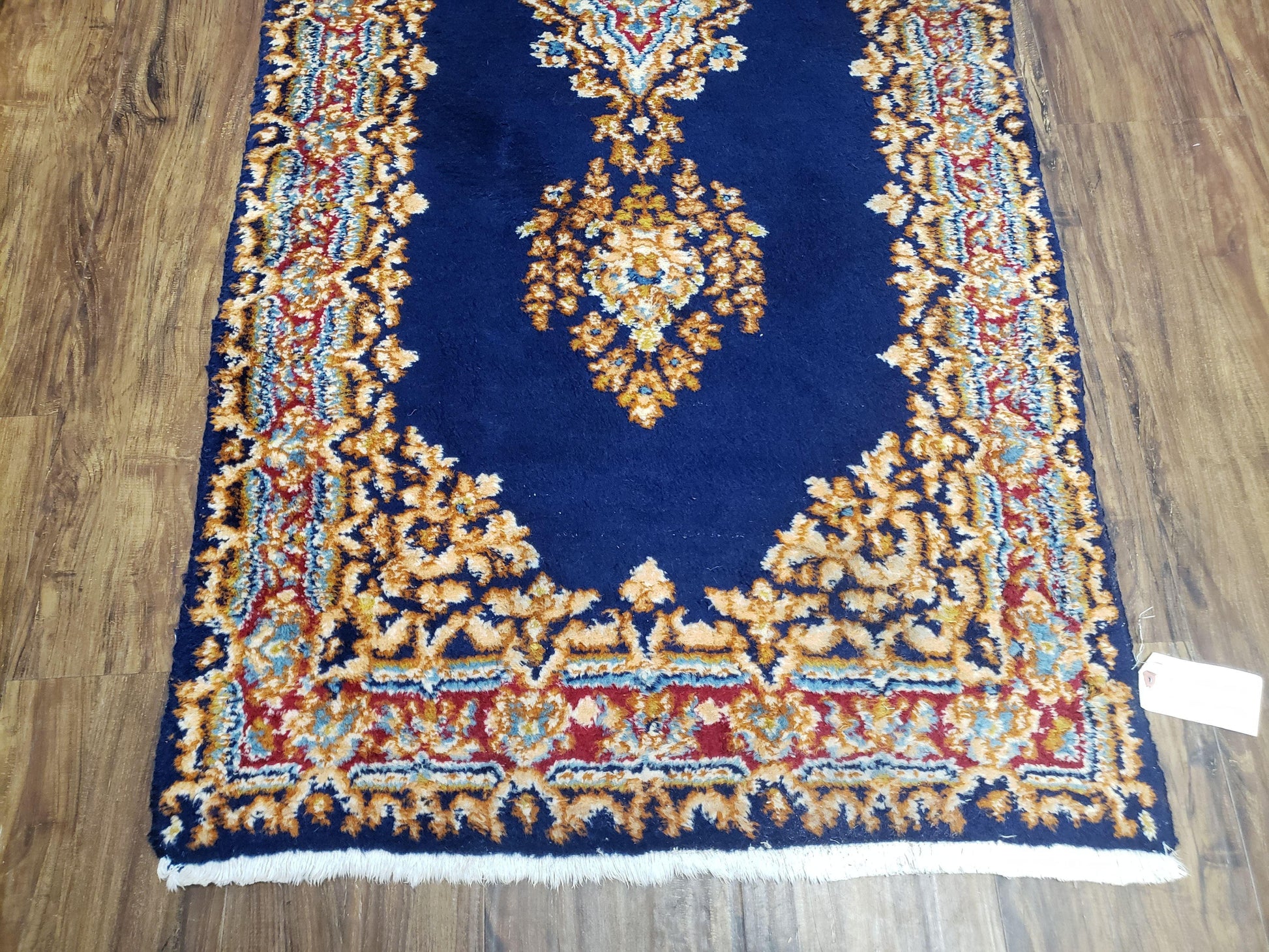Semi Antique Dark Blue Persian Kerman Runner Hand Knotted Wool Open Field Medallion