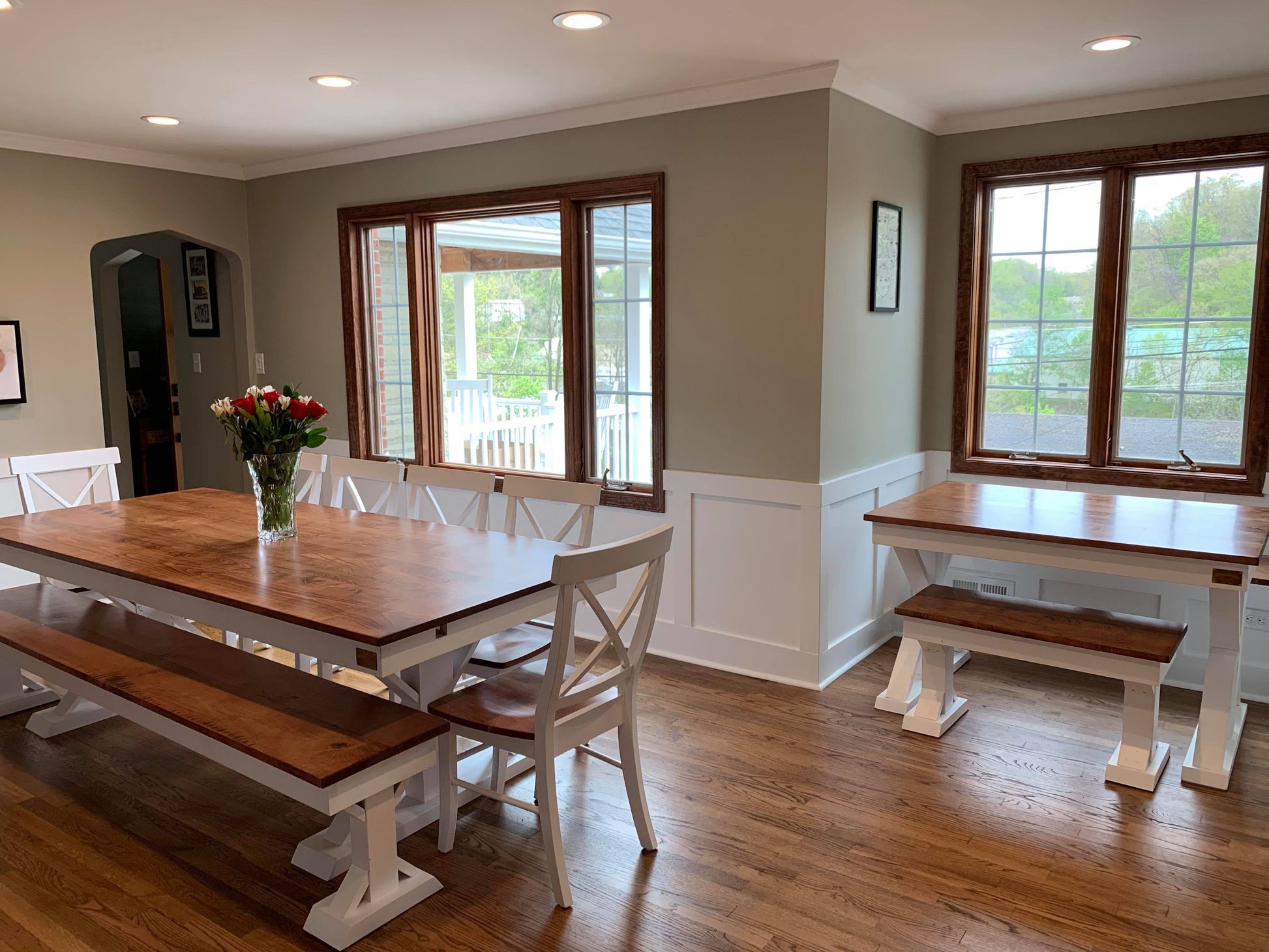 - Finish options: Stained to match your table; Painted black with the seat stained to match the table; Painted white with the seat stained to match the table