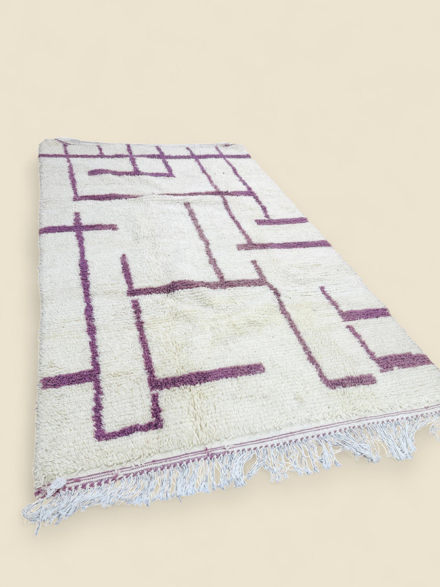 This luxurious rug features a soft cream wool base adorned with mauve geometric lines, giving it a bold yet minimalist aesthetic that complements any modern or bohemian home. Each piece is hand-knotted using 100% natural wool, ensuring softness, durability, and authenticity.