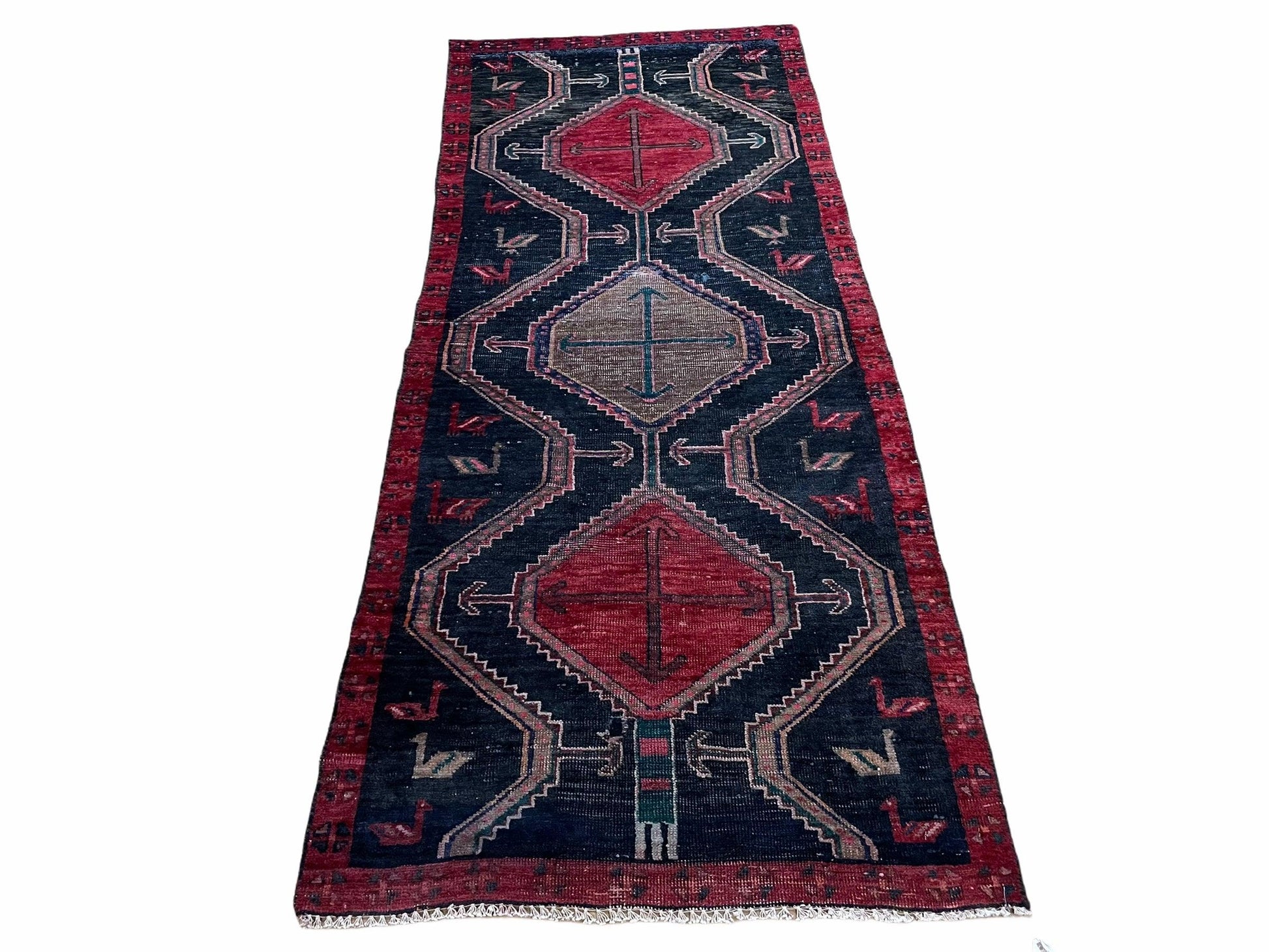 Handmade Wool Tribal Runner Rug 3X7 Geometric Boho Red Blue Organic Dyes