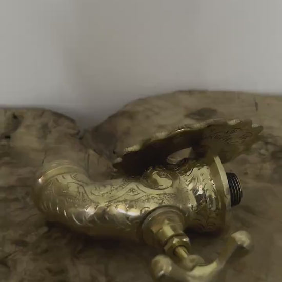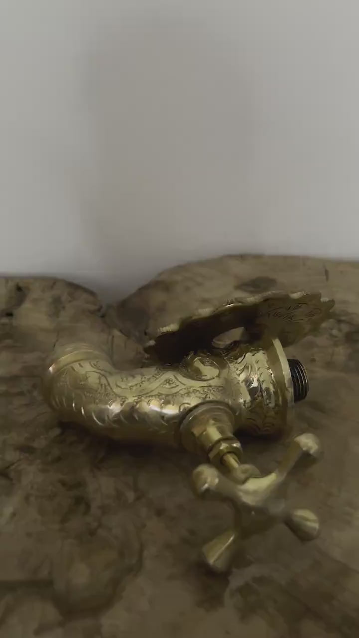 This faucet is crafted from unlacquered brass, allowing the material to naturally age over time, resulting in a beautiful patina. The faucet features intricate Moroccan engravings, adding an exquisite touch to its design.