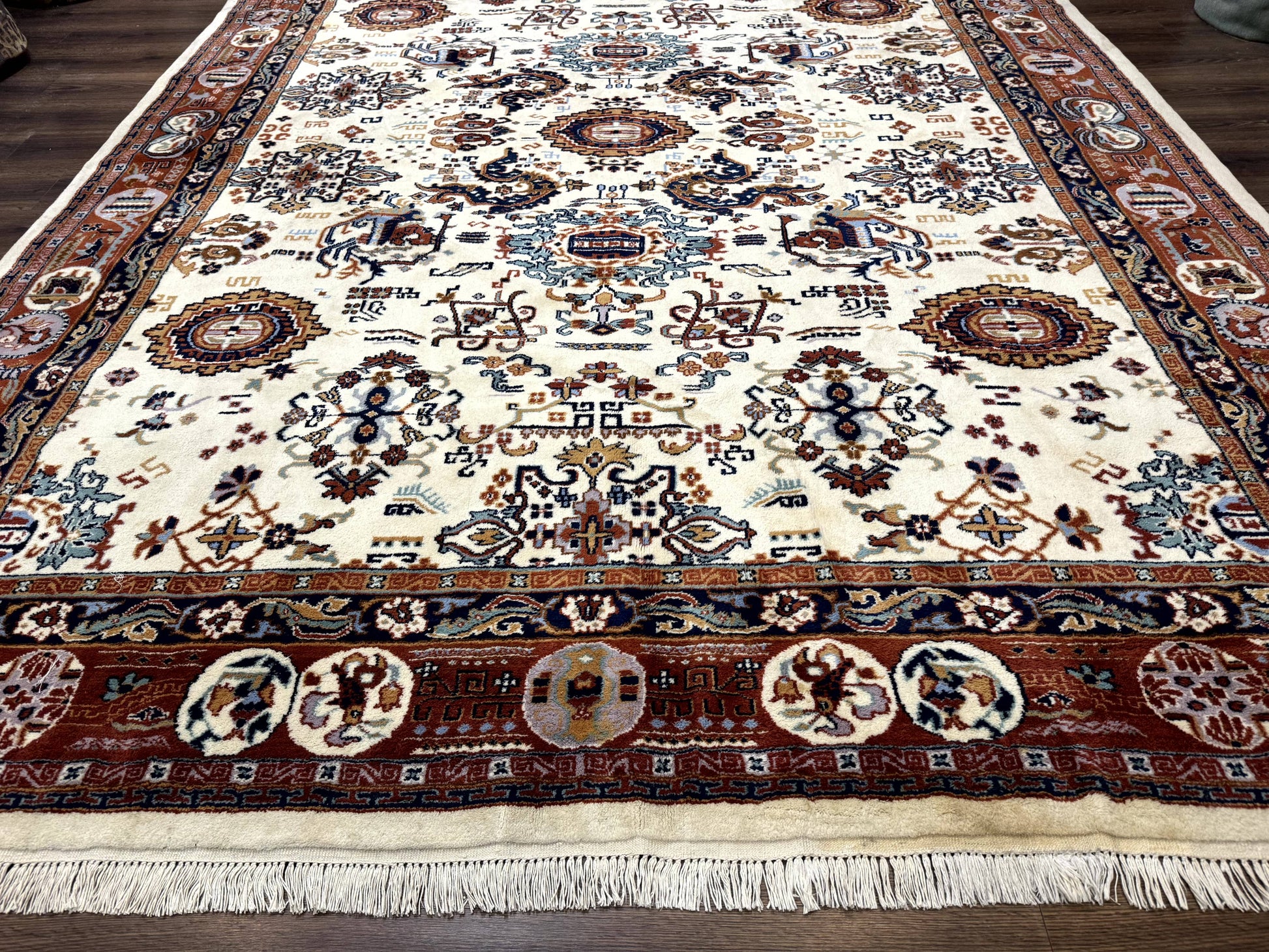 Indo Chinese Wool Rug 9x12 Ivory And Rust Red Dragon Motifs Hand Knotted