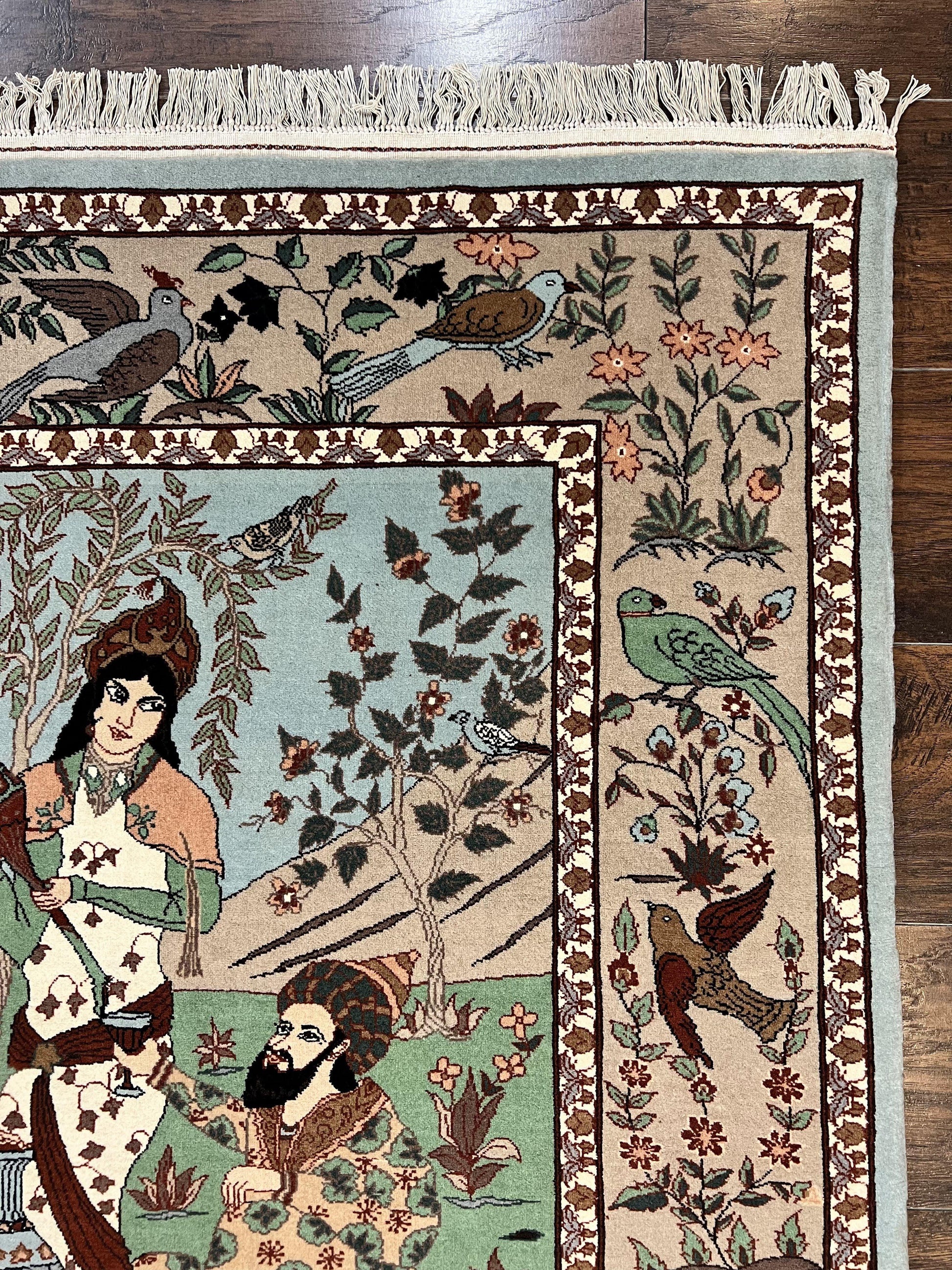 Indo Persian Pictorial Rug 4x7 Hand Knotted Wool Semi Antique Handmade Bird Pictorial Rug