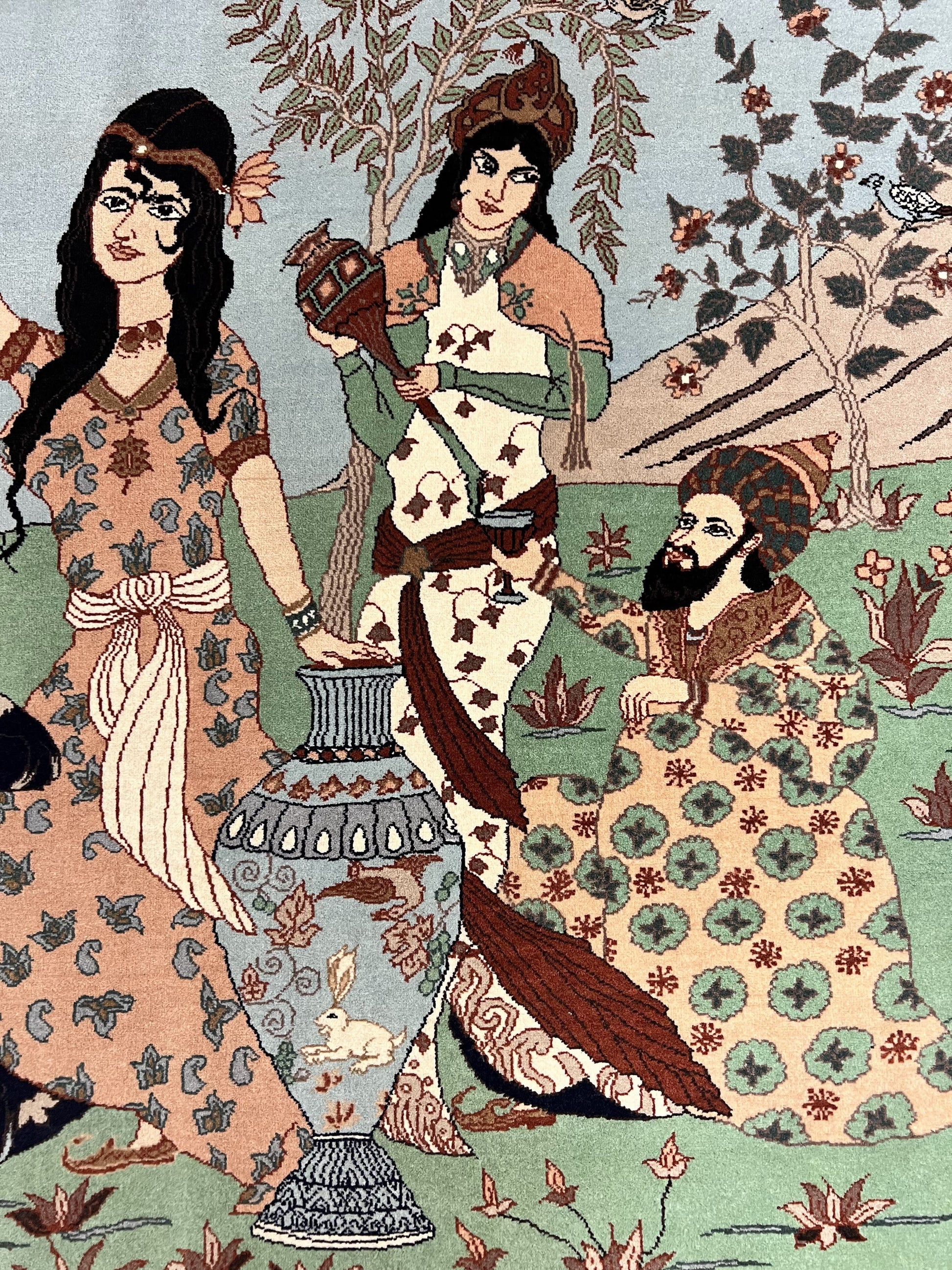 Discover the Indo-Persian Pictorial Rug, a handmade, semi-antique wool carpet that brings artful storytelling to any room. Crafted in India, it features a vivid scene of men and women drinking among bird motifs, offering timeless character and a refined focal point for your space.