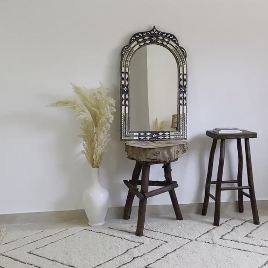 Immerse yourself in exotic elegance with our Luxury Blue Frame Mirror, meticulously crafted by skilled artisans. This breathtaking piece combines bone and brass in a stunning fusion adorned with intricate Berber and Moroccan engravings, echoing the cultural richness of North Africa. The solid bone frame features ancestral Berber motifs, while the metallic-gold brass frame boasts intricate Moroccan designs, adding a luxurious touch to any room. Each mirror is uniquely handmade, ensuring no two pieces are alike, and includes a convenient hook for effortless wall mounting, allowing you to effortlessly enhance any space with its exotic beauty. Whether adorning your living room, bedroom, bathroom, or entryway, this magnificent wall mirror promises to be a timeless masterpiece, captivating with its superb craftsmanship and intricate detailing for years to come.