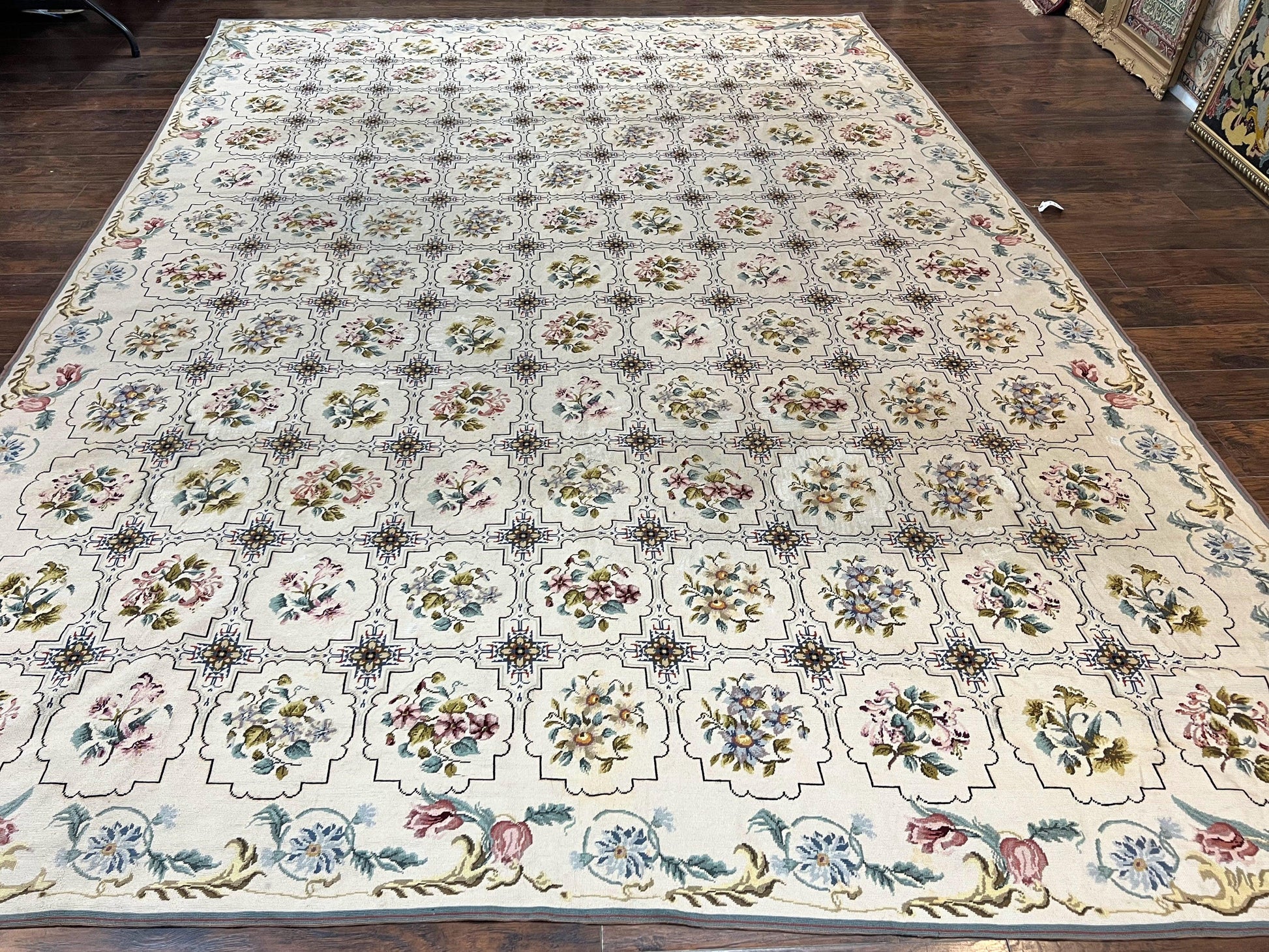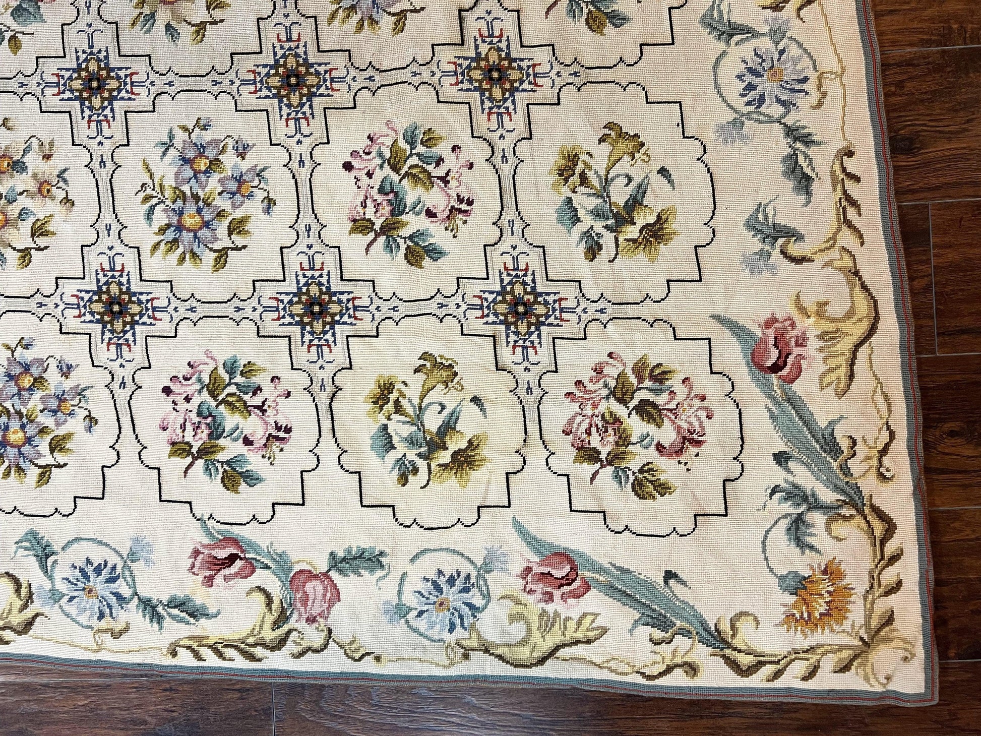 Needlepoint Rug 10x14 Wool Handmade Vintage Floral Panel Ivory Cream