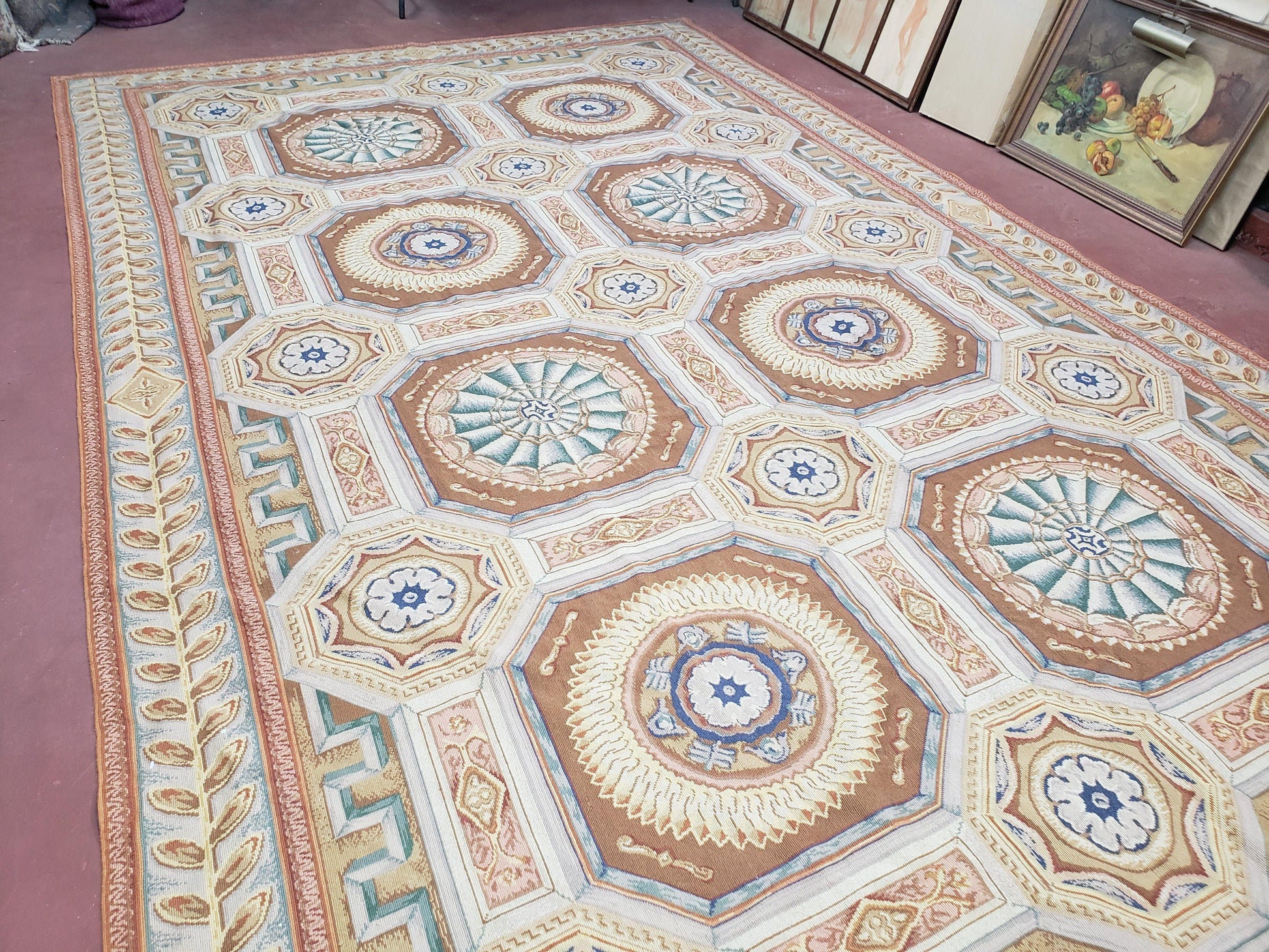 Needlepoint Wool Rug Handmade 8x14 Flatweave Panel Design For Dining Room