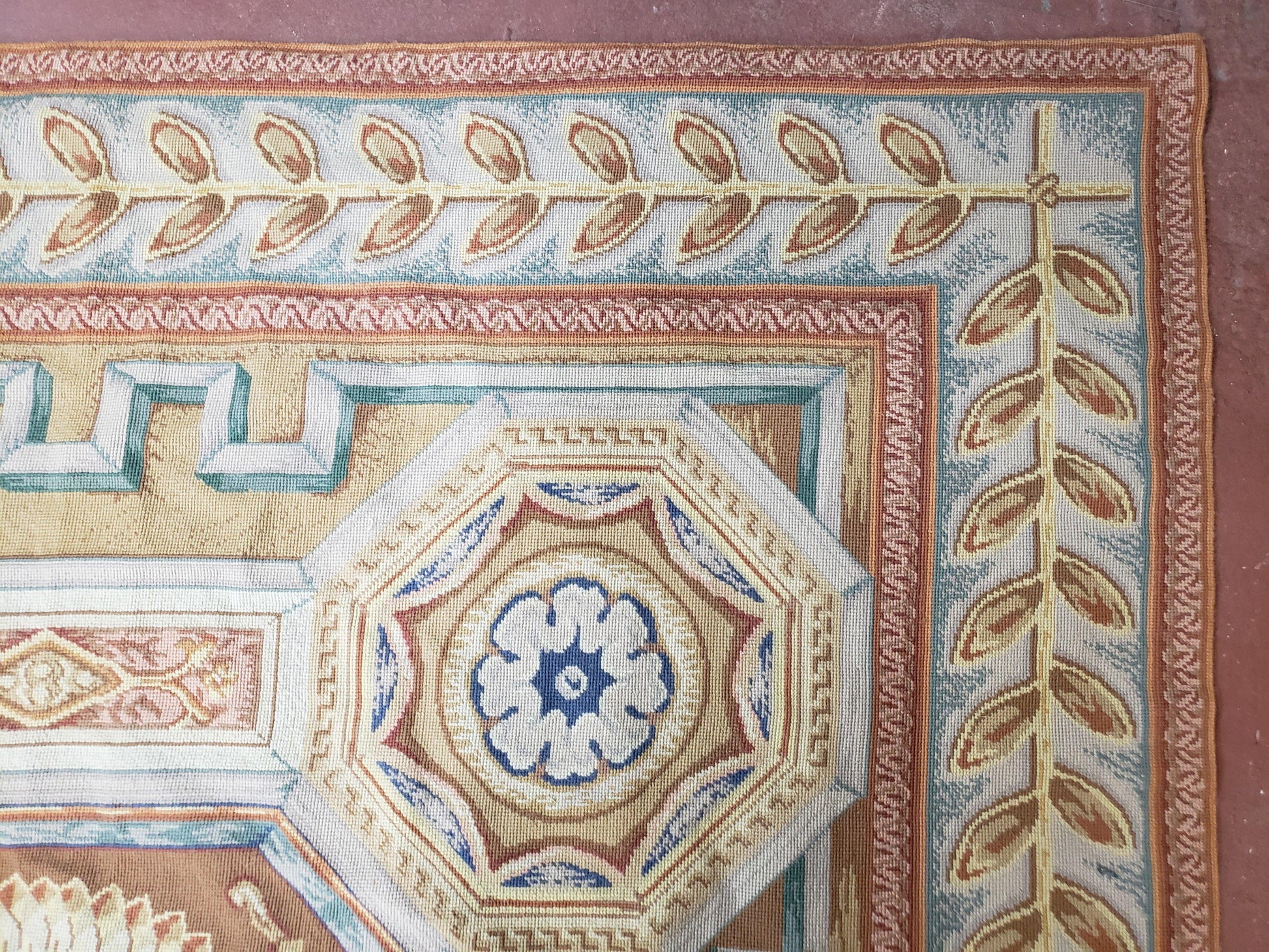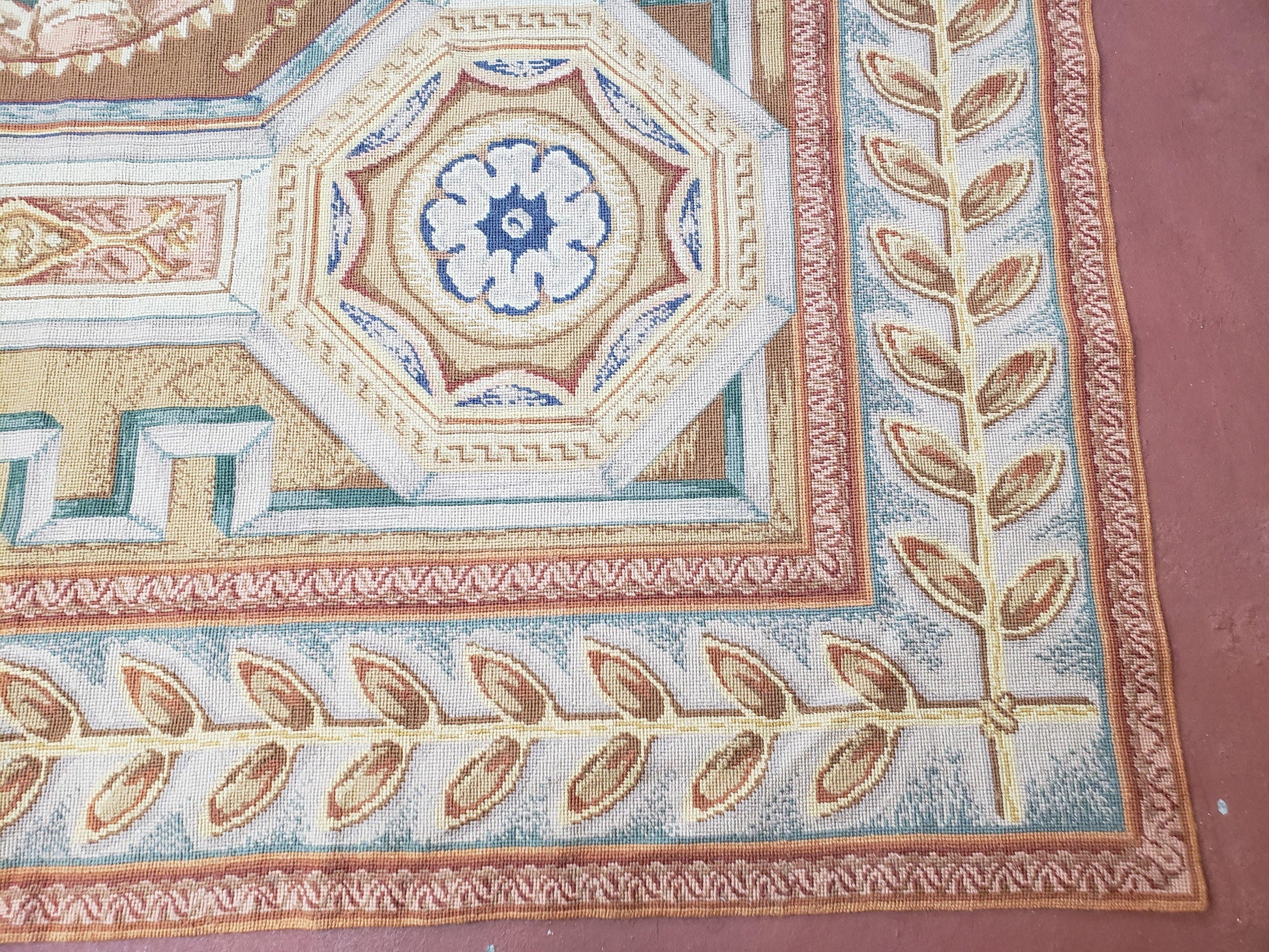 - Construction: Handmade, hand-woven needlepoint; flatweave