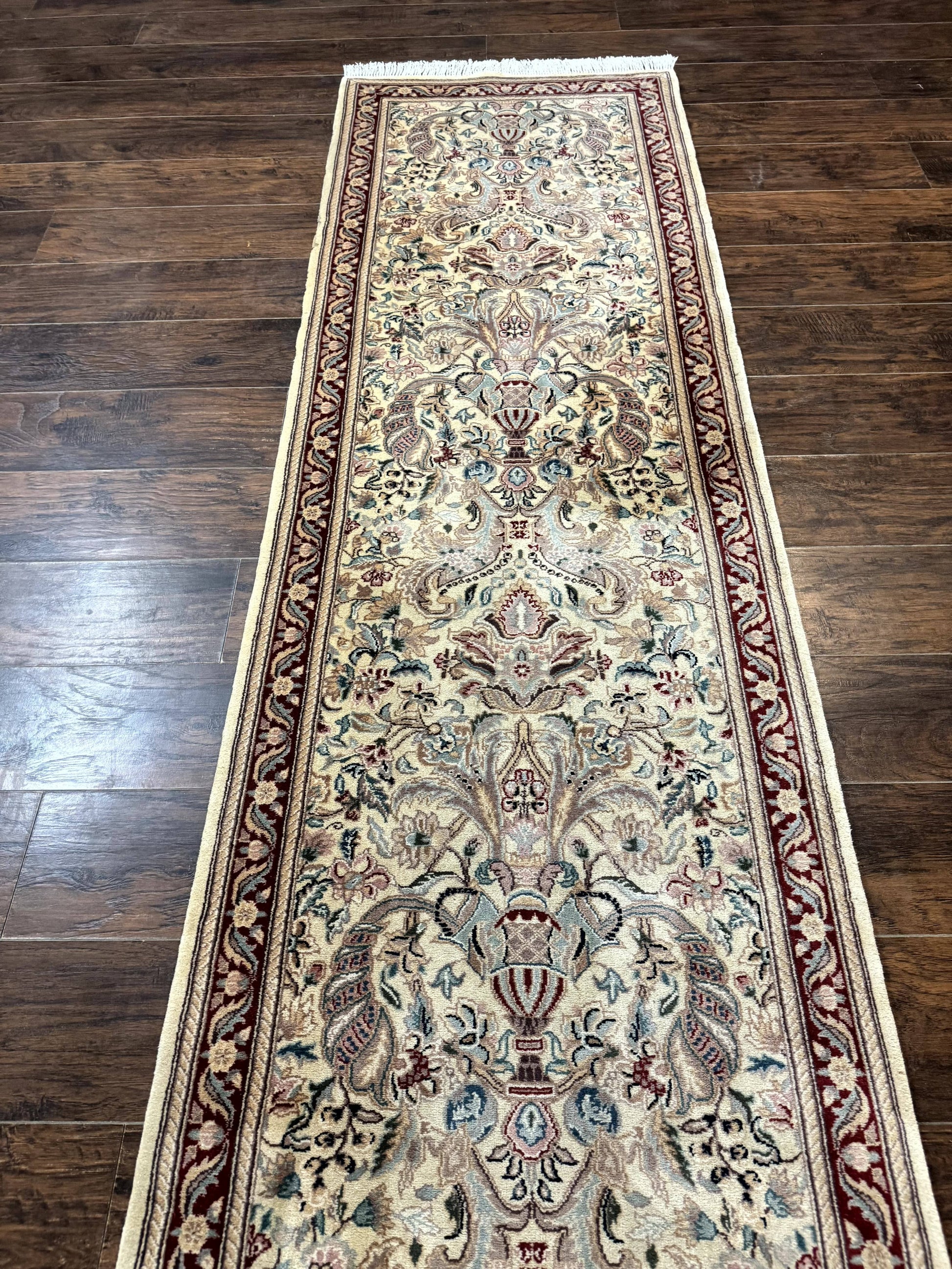 Pakistani Runner Rug 2.8 x 14 Handmade Wool Cream Floral Hallway Accent